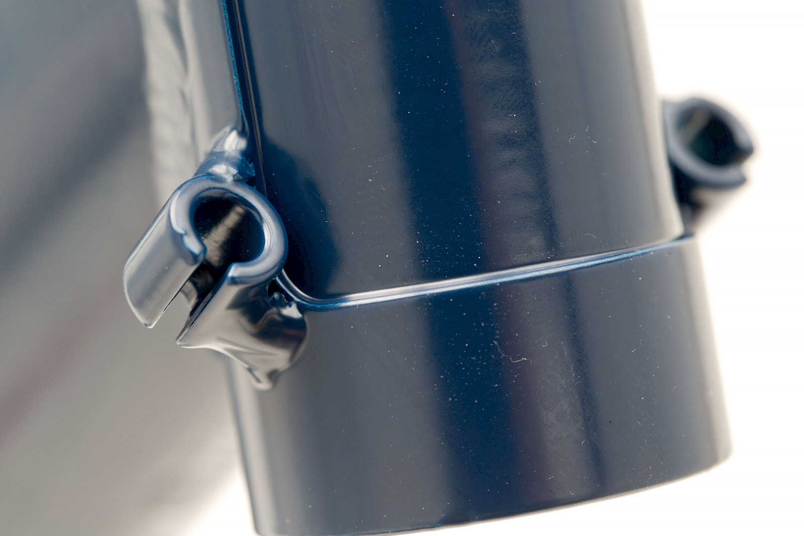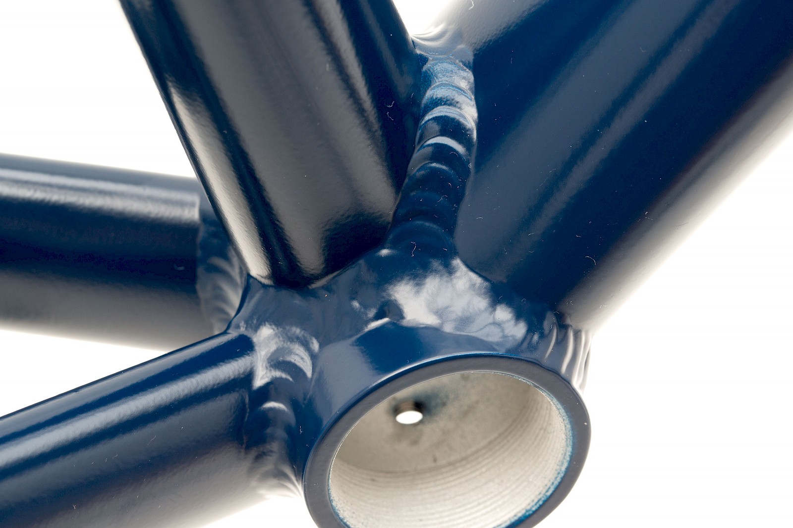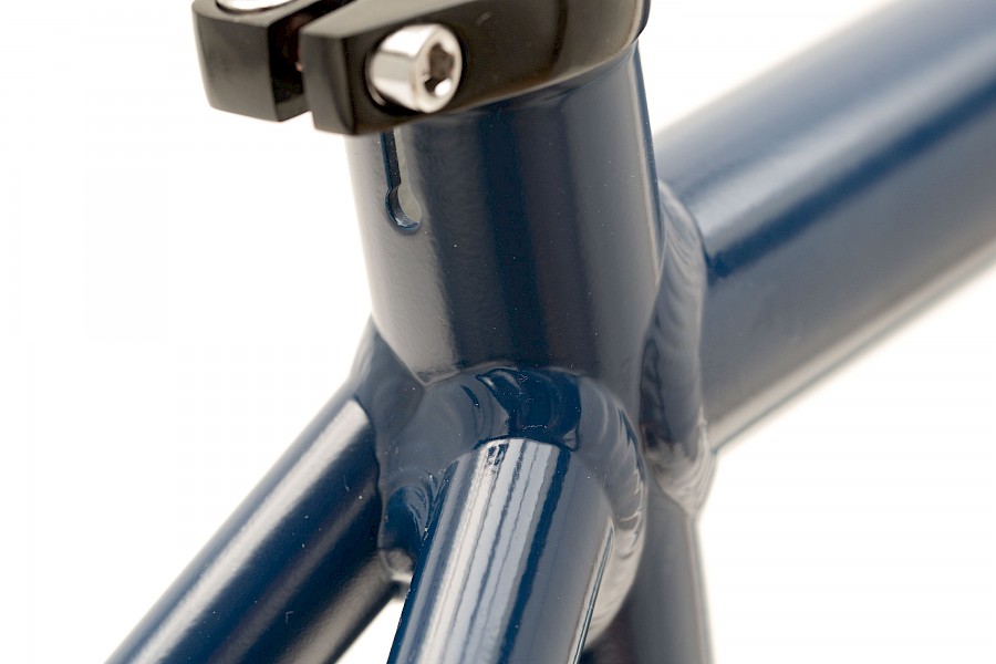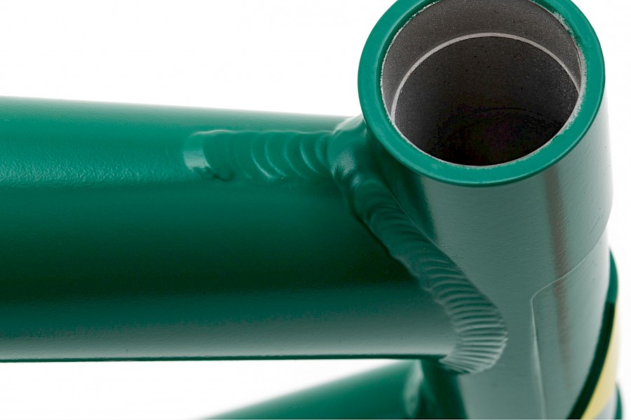 Um zum Beispiel das 40-Millimeter-Oberrohr optimal an das Sitzrohr anschweißen zu können, hat unser speziell gedrehtes Sitzrohr im Fügebereich einen Durchmesser von 37,0 statt der üblichen 34,9 Millimeter. Ober- und Unterrohr weisen im hoch belasteten Steuerrohrbereich vergrößerte Wandstärken auf (2,0 bis 2,3 Millimeter). Das bringt zwar einen hohen Aufwand bei der Rohrfertigung mit sich, steigert aber die Lenkkopfsteifigkeit. Besonders raffiniert und elegant – ein unsichtbares Gusset (Aluprofil) verstärkt die Verbindung von Unter- und Steuerrohr.