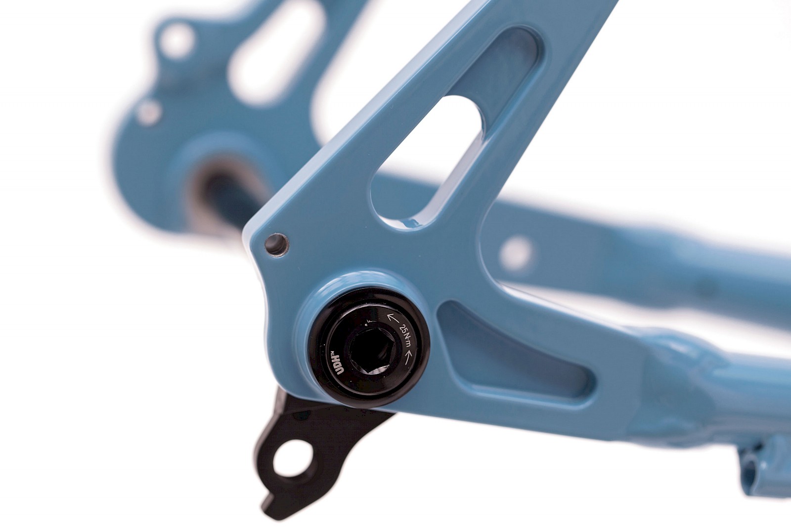 Passend zum reduzierten Erscheinungsbild und der hohen Belastbarkeit lassen wir eigene CNC-Ausfallenden fertigen mit elegant integrierten und hoch belastbaren Gepäckträger-Gewinden, Ständeraufnahmen sowie Scheibenbremsaufnahmen. M5-Gewinde für Schutzbleche und Gepäckträger-Ösen finden sich sowohl an den Sitz- als auch an den Kettenstreben, letztere in einer extra soliden Ausführung.