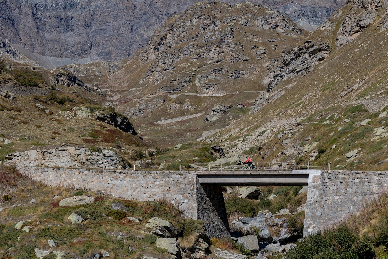 Doch auch die letzten 250 Höhenmeter wollen erstmal gefahren sein, zumal der Anstieg vom Umbrail zum Stelvio nicht besonders schön ist und auch vergleichsweise viel Verkehr herrschte. Kurzum, die zehn Kehren hinauf zur Passhöhe waren erstmals auf der Tour quälend-zäh. Oben angekommen, war ich völlig perplex, wie man eine Passhöhe – noch dazu in einem Nationalpark – so verunstalten kann. Zumal es im Vinschgau eine überraschend hohe Anzahl an Qualitätsarchitektur zu entdecken gibt, wie man das sonst nur von der Schweiz kennt. Ich suchte mir so schnell wie möglich eine sonnige, windgeschützte und abgelegene Ecke, um mich zu sammeln, auszuruhen und Kalorien zu bunkern. Dann ging es bei sich eintrübendem Wetter die gleiche Strecke wieder zurück, die in der Gegenrichtung neue Facetten entfaltet.