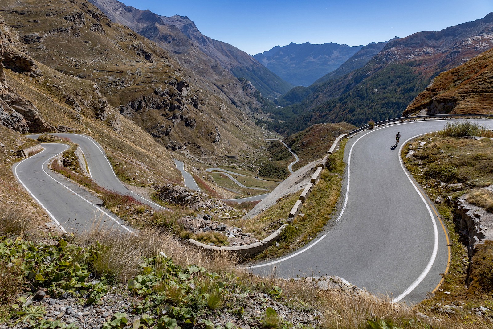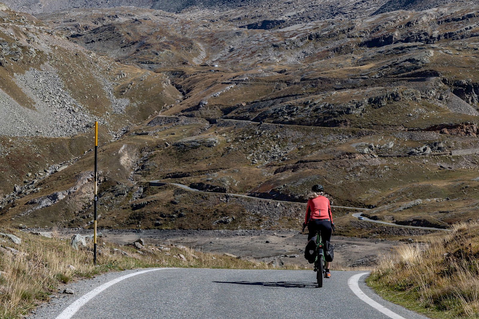 Was für eine Binsenweisheit, doch merkwürdigerweise verliert dieses überschaubare Prozedere – rauf fahren, Aussicht und Endorphine genießen, runter sausen – nie seinen Reiz. Schon im Anstieg, beim langsamen Sich-in-die-Höhe-schrauben, bringt jede Kehre, jede Straßenbiegung einen anderen Blickwinkel. Es ist immer wieder grandios zu erleben, wie sich mit dem Anstieg Landschaft und Vegetation ändern. Ganz großes Kino wird dann oberhalb der Baumgrenze geboten, wenn man mit dem Fahrrad in hochalpine Bereiche vordringt und man von einer grandiosen Bergriesen-Szenerie umgeben ist. Diese Höhen und Regionen aus eigener Kraft erreicht zu haben, ist einfach ein unbeschreiblich erhabenes und süchtig machendes Gefühl. Anderseits fühlt man sich im Angesicht der Bergriesen und Naturgewalten so unendlich klein und verwundbar – Pässe fahren ist eben auch eine herrliche emotionale Achterbahnfahrt.