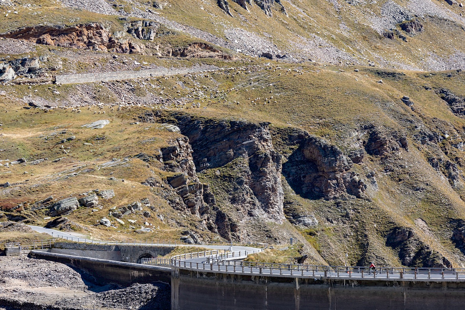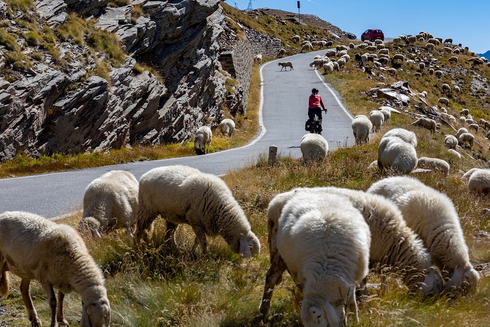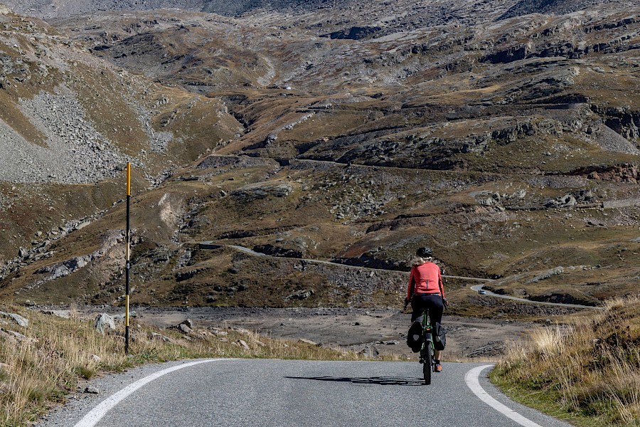 Imposant bauten sich an diesem glasklaren Morgen die Berge vor uns auf. Man fühlt sich da ziemlich klein, und es ist schwer vorstellbar – Pedelec hin oder her –, wie und ob man da hinauf kommt. Trotz Sonne war es empfindlich kalt, so dass wir auch noch eine reduzierte Akkuleistung einkalkulieren mussten. Nachdem der erste von fünf Balken früher weg war als erwartet, reduzierten wir erstmal unser Tempo, denn die ersten Kilometer waren wir im zügigen Nordschwarzwaldmodus gefahren, und auch im Eco-Modus kostet ein höheres Tempo Reichweite. Ab 1.800 Meter machten uns eiskalte Fallwinde zu schaffen, zum Ausgleich wurde die Landschaft nochmals grandioser und die Passhöhe kam weit oben schon mal in Sichtweite. Im finalen Anstieg landeten wir noch in einer völlig unerschrockenen Schafherde, die sich von nichts und niemanden aus der Ruhe bringen ließ. Mit nur einem Ladebalken und roter Anzeige erreichten wir schließlich die Passhöhe und suchten einen sonnigen und windgeschützten Aussichtsplatz für eine Genusspause. Wer rauf fährt, darf bzw. muss auch wieder runter, also alles anziehen was die Packtaschen hergeben und sich dann dem Abfahrts- und Landschaftsrausch hingeben ;-)