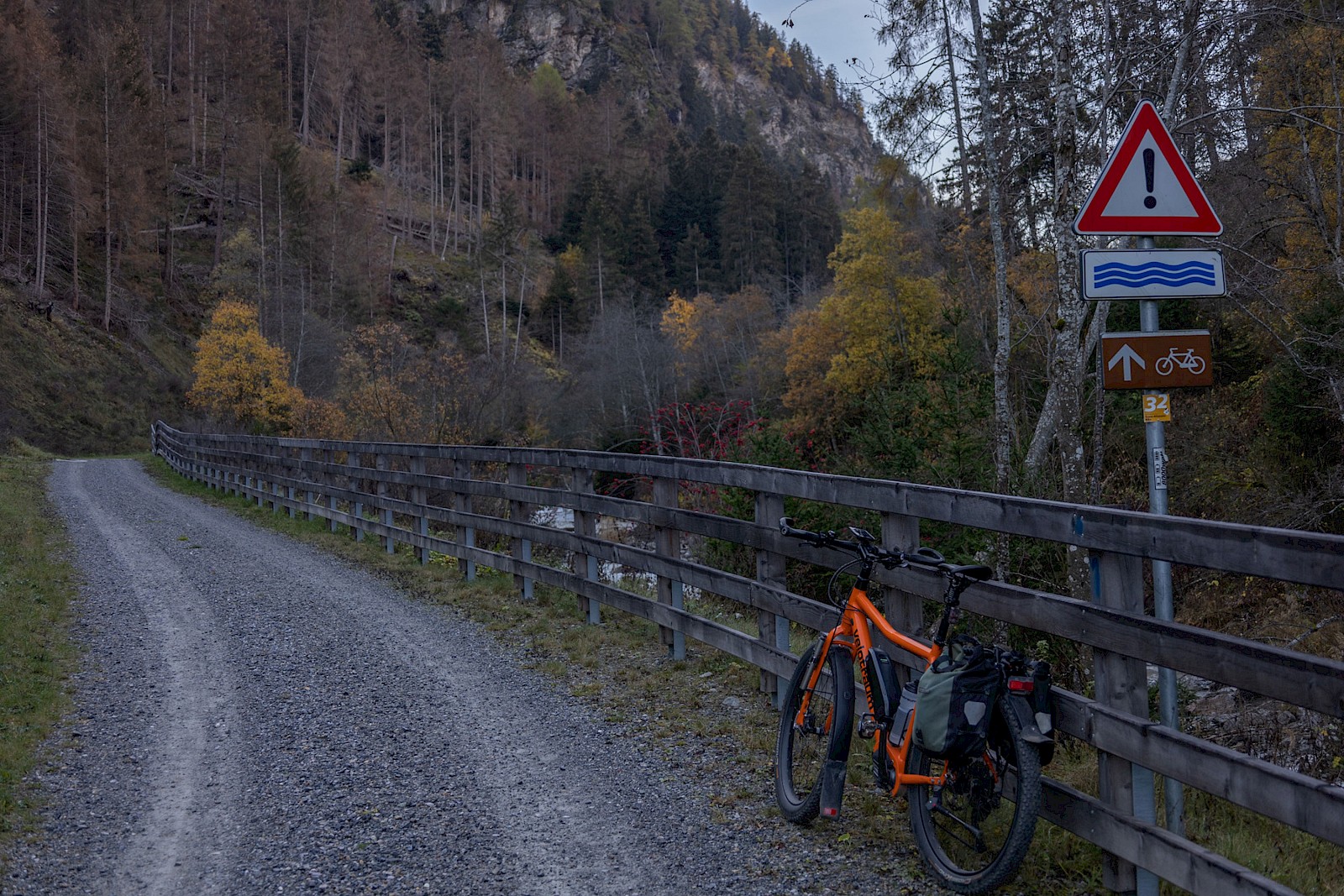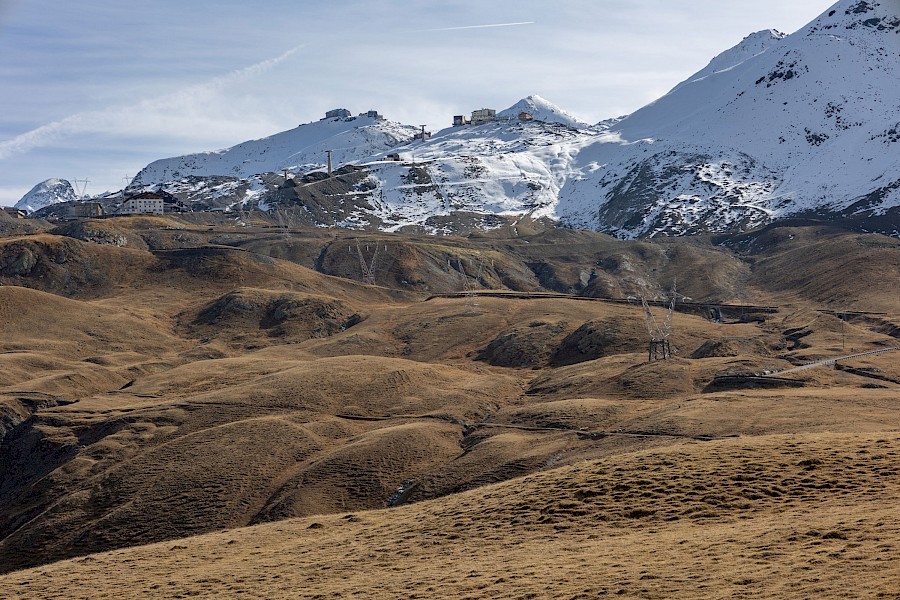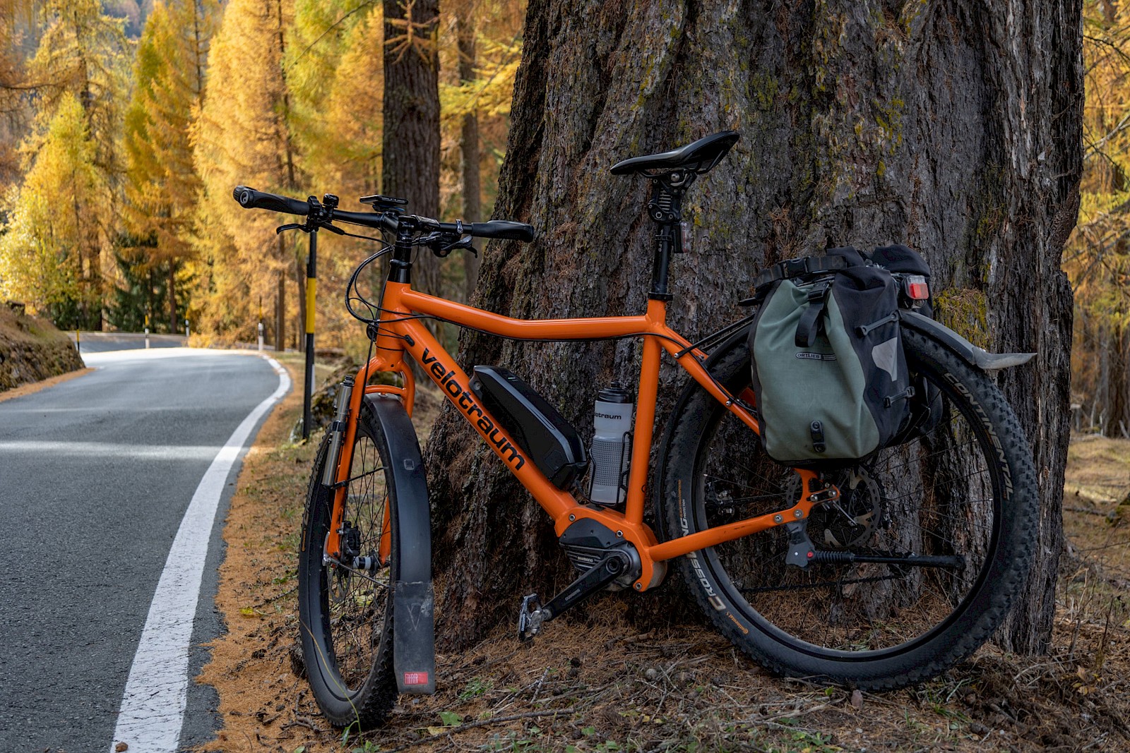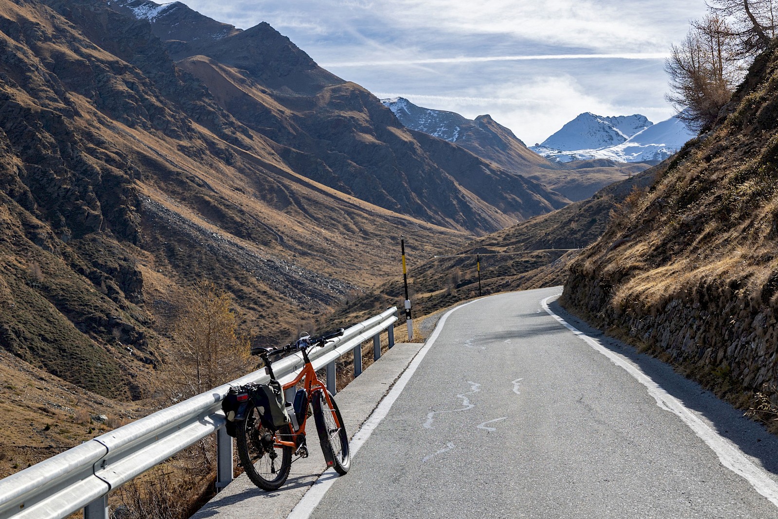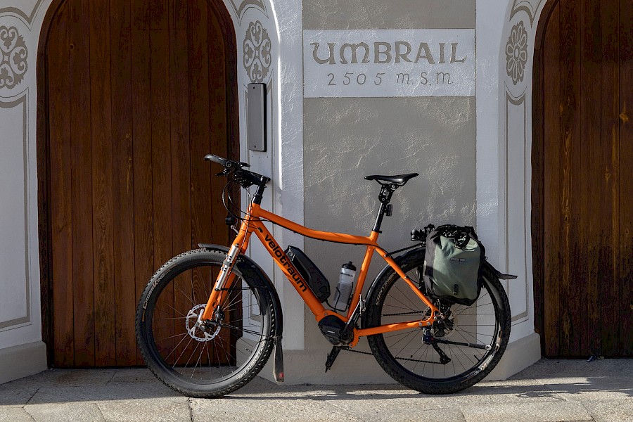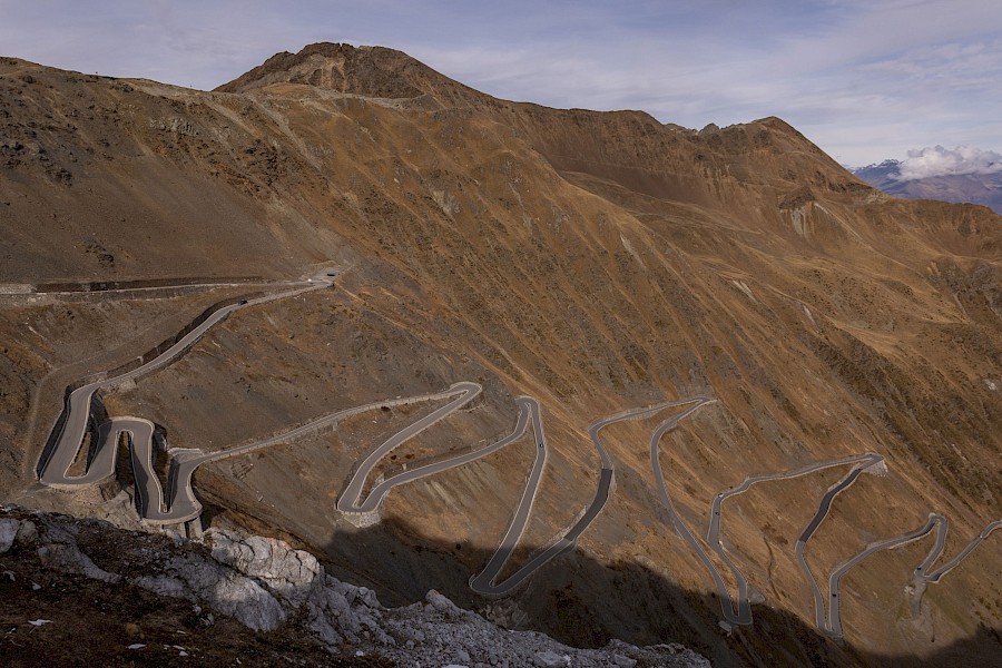 Zunächst zögerte ich, denn das Wetter war zu wechselhaft, und in den Nächten gab es bereits Frost. Außerdem war ich für solche Höhen auch nicht ausgerüstet, hatte also nicht die entsprechende Bekleidung dabei. Am 2. November strahlte die Sonne aber so verführerisch von einem tiefblauen Himmel, dass ich mich zumindest am Umbrail versuchen wollte. Zum Umbrail-Pass war nicht nur die Anfahrt kürzer, er war auch gut 250 Höhenmeter tiefer als der »Stelvio«, was obenraus durchaus einen Unterschied machen kann. Eingedenk unserer Piemont-Erfahrungen und in Anbetracht der mindestens 1.600 Höhenmeter sowie Temperaturen um den Gefrierpunkt stopfte ich den Ersatzakku und warme Radklamotten in die Ortliebtaschen.