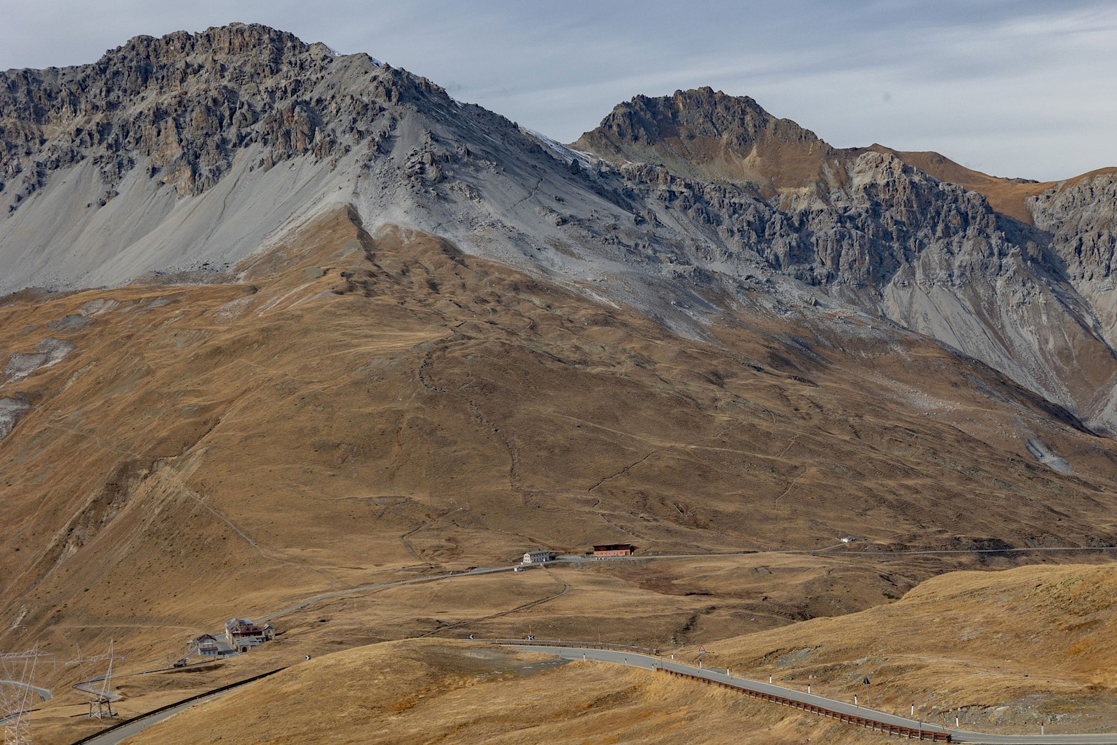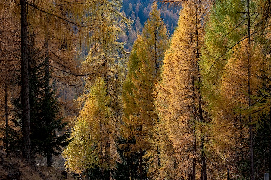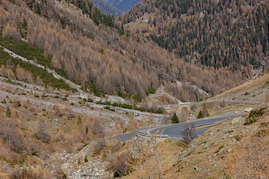 Schon wenige hundert Meter die Passhöhe hinauf tauchte ich in betörend schöne Lärchenwälder mit wunderschöner Herbstfärbung ein. Auch die Passstraße selbst ist schlicht grandios: schmal, wunderschön geführt und tipp-topp in Ordnung – Schweiz halt! Zudem hatte ich die Straße und die landschaftliche Herbstsinfonie für mich allein, denn nur eine handvoll Autos und ein Radfahrer sollten mir bis zur Passhöhe begegnen – Die Gunst der späten Jahreszeit.