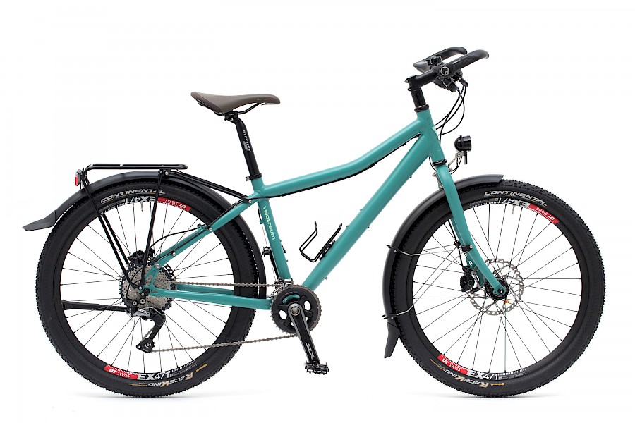 - KONZEPT VK5 – Ein formal und funktional wunderschönes Rad mit 26-Zoll-Laufrädern. Ungewöhnlich ist die sportlich-leichte Stollenbereifung, deren Leichtbau-Potential in den DT-Swiss-Felgen ihre Fortsetzung findet. Trotz der komfortablen Sitzposition beschleunigt sich dieses Kundenrad sehr flott und geht wieselflink um die Ecken. Zunehmend entscheiden sich auch viele Kunden, die ein multifunktionales Rad suchen, für die 1×11-, anstelle der traditionellen 3×10-Kettenschaltung. >>> VK5