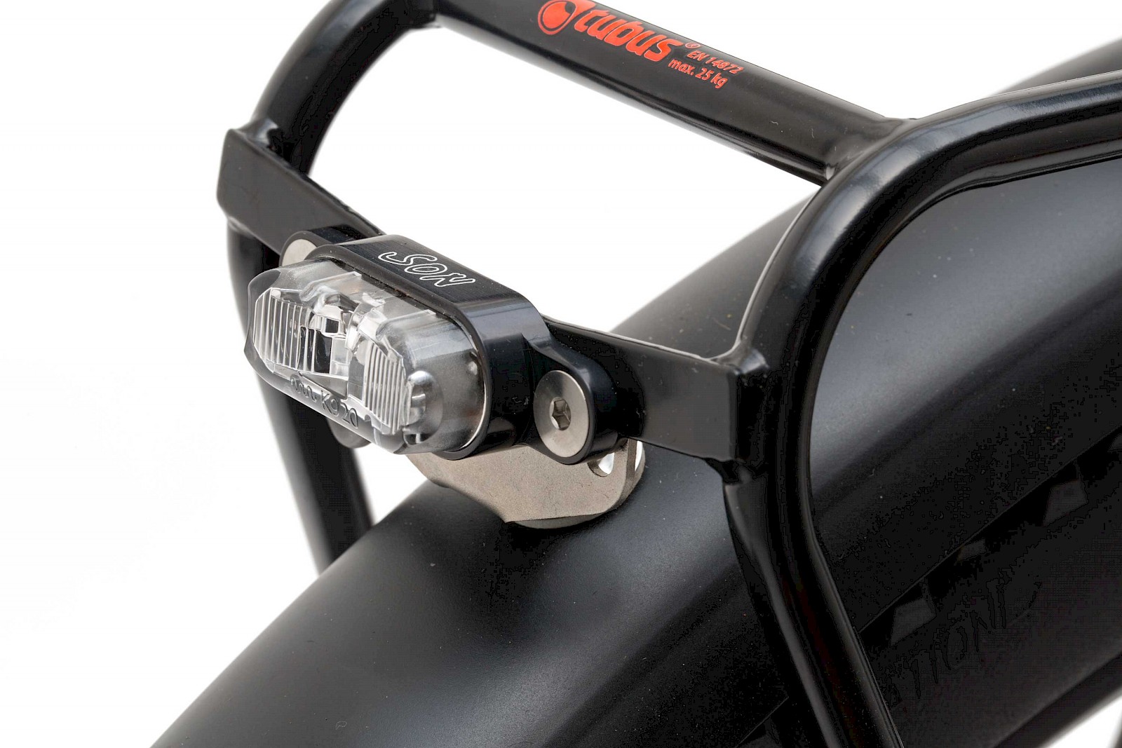 Wie man sieht sind einige Tuning- und Bestandsteile zum Einsatz gekommen, so zum Beispiel Klingel, Sattelstütze, Flaschenhalter, Schläuche und Sattelklemme. So ganz nebenbei hat Pit auch noch eine elegante und SON-Rücklicht-adäquate Lösung für die Schutzblechbefestigung am Gepäckträger gefunden. Zumindest bei dieser konkreten Kombination aus Schutzblechmodell, Reifenformat und Rahmen passt ein Tubus Schutzblechhalter aus Edelstahl. Nicht zu verachten ist auch das Gewicht: 13,5 Kilogramm sind für ein Rad mit dieser Ausstattung durchaus beachtenswert.