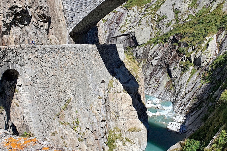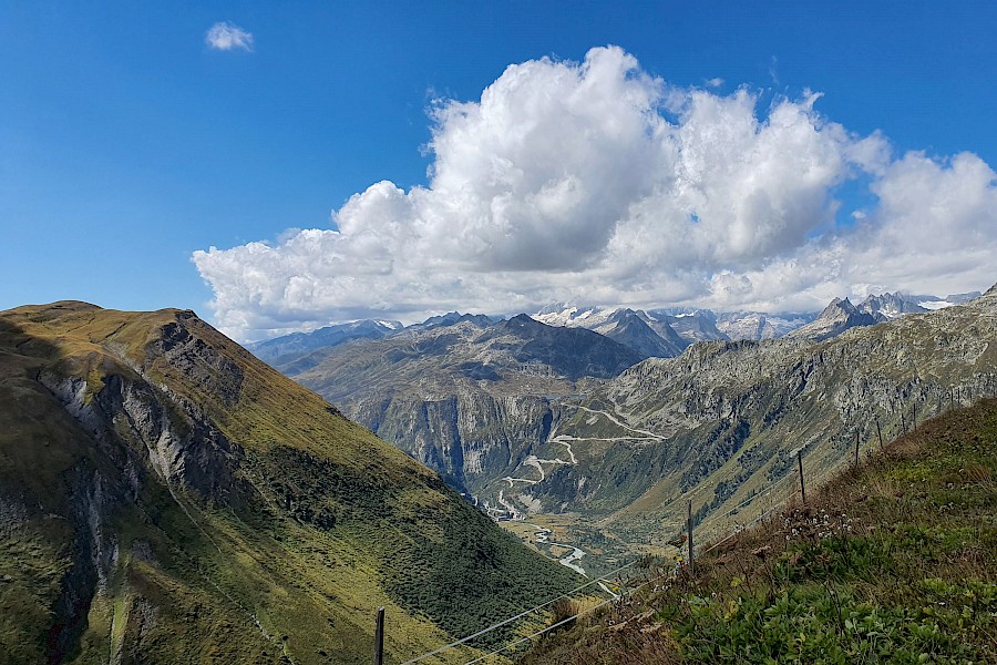 So sind wir erst anfang September, nach ein paar richtig verregneten Tagen, in die Schweiz gestartet. Das war die richtige Entscheidung und der Campingplatzbesitzer am Zuger See, der ersten Übernachtung, meinte es wäre der erste Tag an dem der Platz nicht ausgebucht sei. Für den zweiten Campingplatz beim Vierwaldstätter See galt das schon nicht mehr, immerhin konnten wir 2 Nächte bleiben. Es gab dieses Mal wirklich keine geplanten Routen, jeden Abend wurde entschieden wie es weiter gehen soll. Auch wenn mit der Entscheidung nach Andermatt zu fahren, doch eine gewisse Vorentscheidung wie es weitergehen würde gefallen ist. Wieder einmal sind wir auf der Gotthartstraße unterwegs. Da es vor dem Gottharttunnel einen langen Stau gab, war etwas mehr Verkehr, kommt leider immer öfter vor. Ich liebe diese Gegend, dieses gewaltige Tal ist einfach beeindruckend. Besonders schön der letzte Abschnitt durch die Schöllenenschlucht von Göschenen nach Andermatt. Sehr gelungen ist der erst letztes Jahr fertiggestellte Radweg durch die Schlucht.