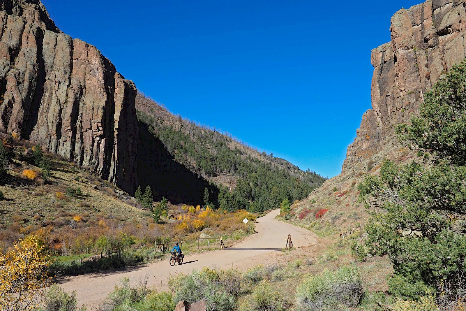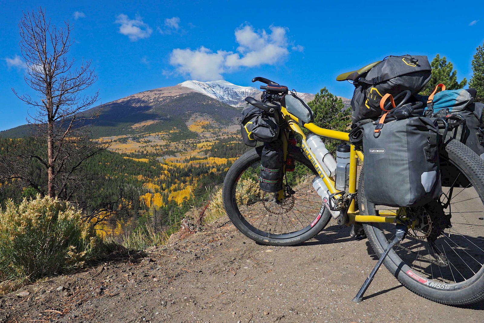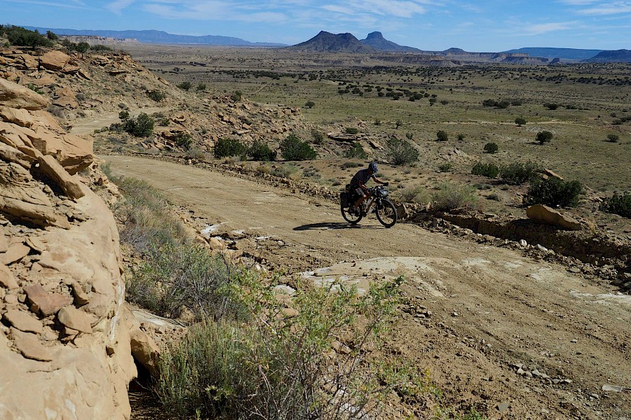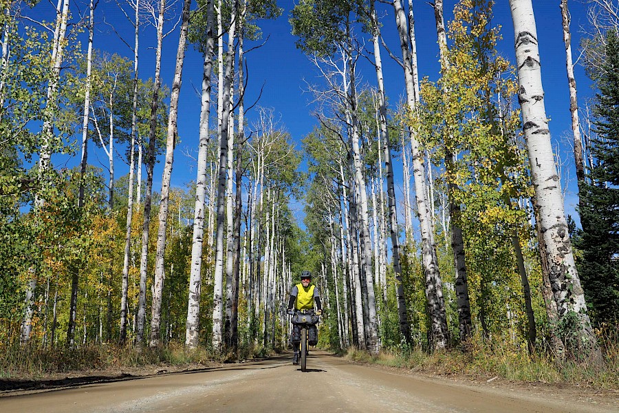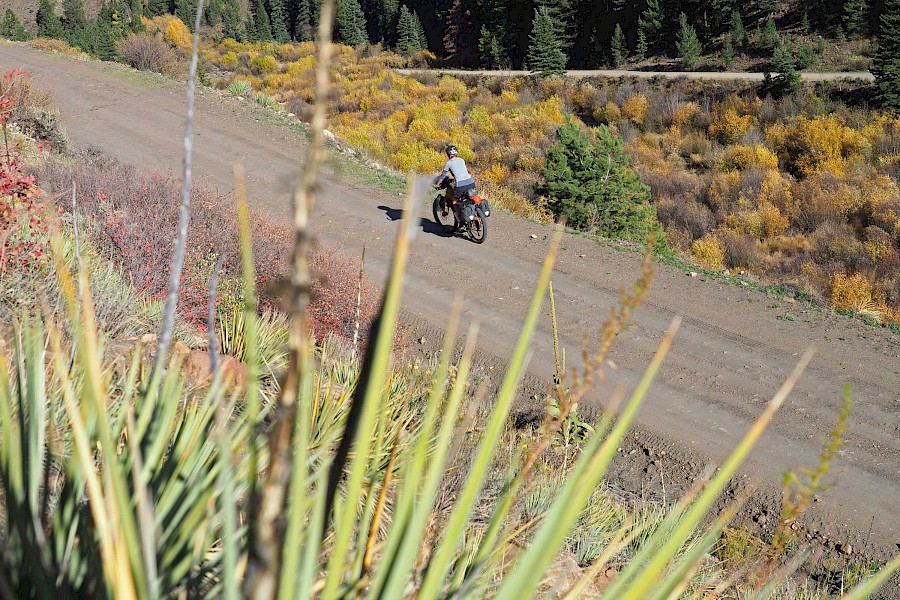 Nach einigen spektakulären Passüberquerungen bei 30 Zentimeter Neuschnee und klirrend kalten Nächten mit gefrorenen Wasserflaschen, stellt sich langsam aber sicher wieder stabileres Wetter ein. Wir erleben einen grandiosen „Goldenen Herbst“ in Colorado und meistern extrem anspruchsvolle und einsame Passagen im Norden New Mexicos. Hier bewähren sich unsere Räder so gut, dass wir manchmal sogar ausgewachsene Geländewägen auf verblockten Felspassagen bergab überholen! „Awesome“, würde ein echter Ami sagen!