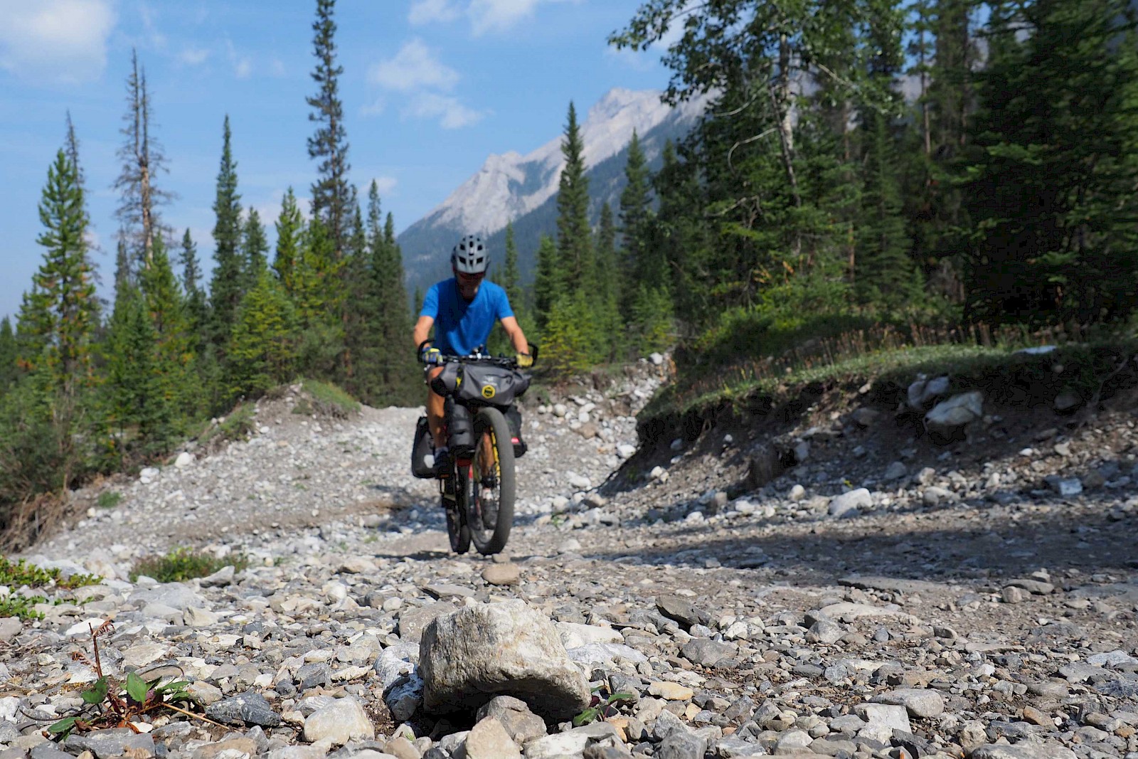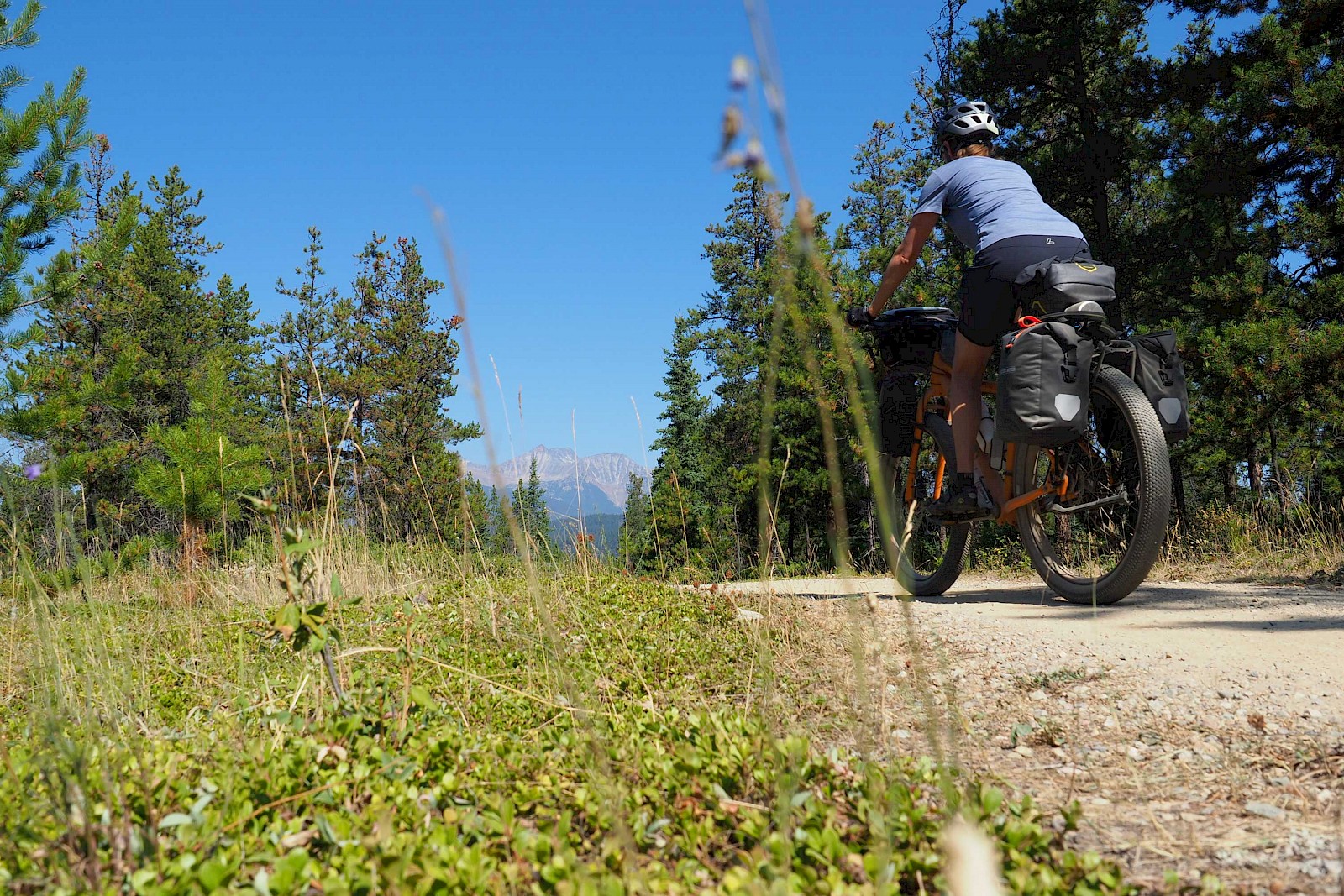 Nach ein paar gemütlichen „Einradel-Tagen“ auf dem Icefields Parkway, einer der schönsten Fernstraßen der Welt, starten wir am 16. August voller Vorfreude und etwas nervös in unser neues Abenteuer. Hinter dem alten Banff Springs Hotel führt ein unscheinbarer Schotterweg hinein in die faszinierende Wildnis Kanadas. Die ersten Kilometer abseits des Asphalts fühlen sich dank unserer FINDER hervorragend an! Sanft bügeln die 2,8 Zoll breiten Reifen die kleinen Unebenheiten und den Schotter aus – ein riesiger Komfortgewinn im Vergleich zu unseren alten Reiserädern! Was uns auch sofort auffällt, ist der enorme Sicherheits-Gewinn in Kurven und bei rasanten Abfahrten – man fühlt sich fast wie auf Schienen! Voraussetzung für ein ausgewogenes Fahrverhalten ist auf jeden Fall der Luftdruck unserer 2,8 Zoll G-One Tubeless-Reifen von Schwalbe. Während wir auf Schotter mit etwa einem Bar fahren, pumpen wir bei längeren Asphalt-Passagen 1,5 bis 2 Bar in die Schlappen, was das Abrollverhalten erstaunlich positiv beeinflusst. Gerade auf Asphalt hätten wir das nicht erwartet. Der G-One ist zudem relativ leise und macht so selbst längere Straßenstücke zu einem Genuss. Doch wie bereits erwähnt, entfaltet der FINDER sein volles Potential erst abseits des Asphalts. Möglichkeiten, dies auszukosten, haben wir in den nächsten Wochen auf jeden Fall mehr als genügend.