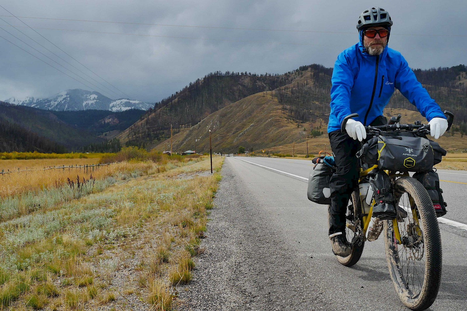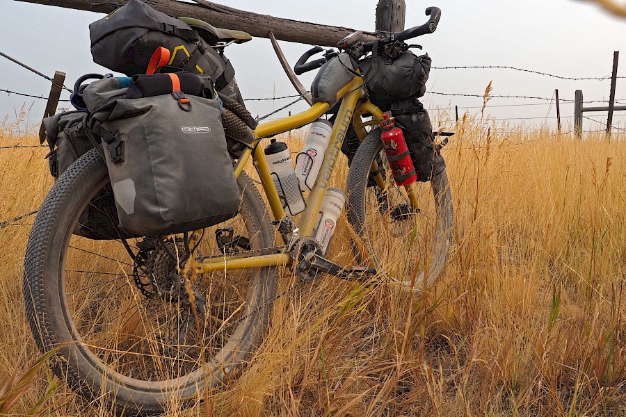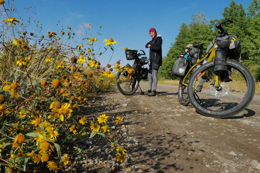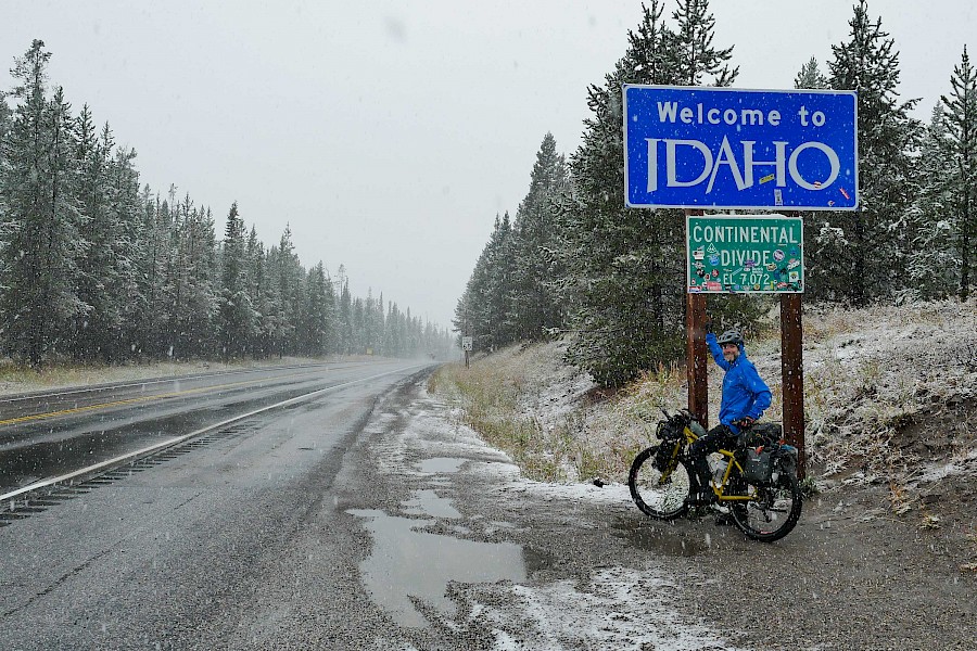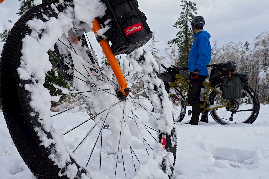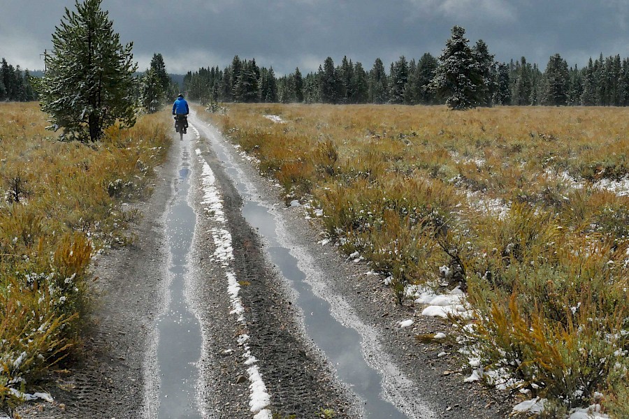 Fast ausschließlich auf einsamen Forststraßen und einigen herausfordernden Trail-Passagen geht es in sieben Tagesetappen bis zur Grenze in die USA, wo wir aufgrund der verheerenden Waldbrände in Montana einige Umwege nehmen müssen. Nach einem Monat „Schönwetter-Radeln“ erreicht uns im Yellowstone Nationalpark schließlich ein viel zu früher Gruß des Winters. Gerade noch radeln wir im kurzen Shirt durch die Rauchwolken der mächtigen Waldfeuer in Montana, schon tragen wir alle Klamotten, die wir in den Taschen haben und kämpfen gegen den viel zu frühen Wintereinbruch in Idaho und Wyoming. Eine neue Herausforderung für unsere FINDER! Drei Wochen lang kämpfen wir mit Nassschnee, verschlammten Pisten und Regen. Viel Regen. Unsere FINDER stoßen teilweise an ihre Grenzen, was aber angesichts der teils miserablen Bedingungen kein Minuspunkt sein soll. Selbst mit einem ausgewachsenen Fatbike wäre hier oft Schluss gewesen!
