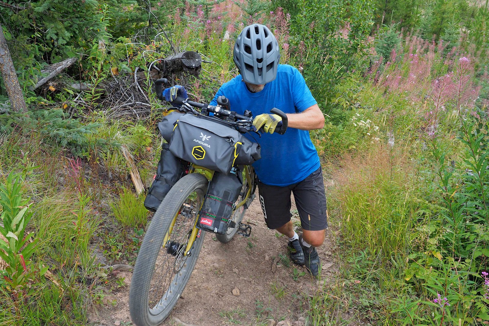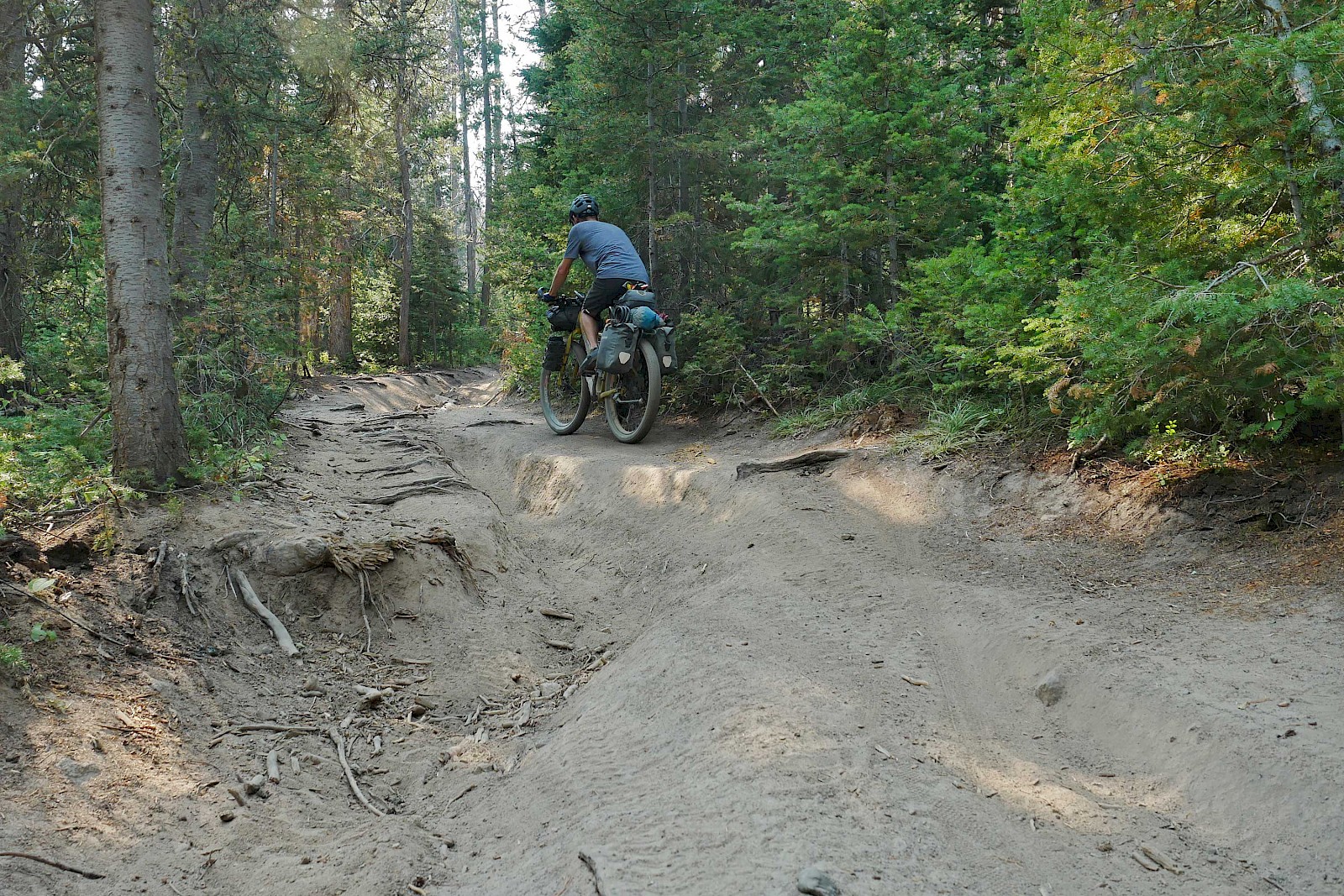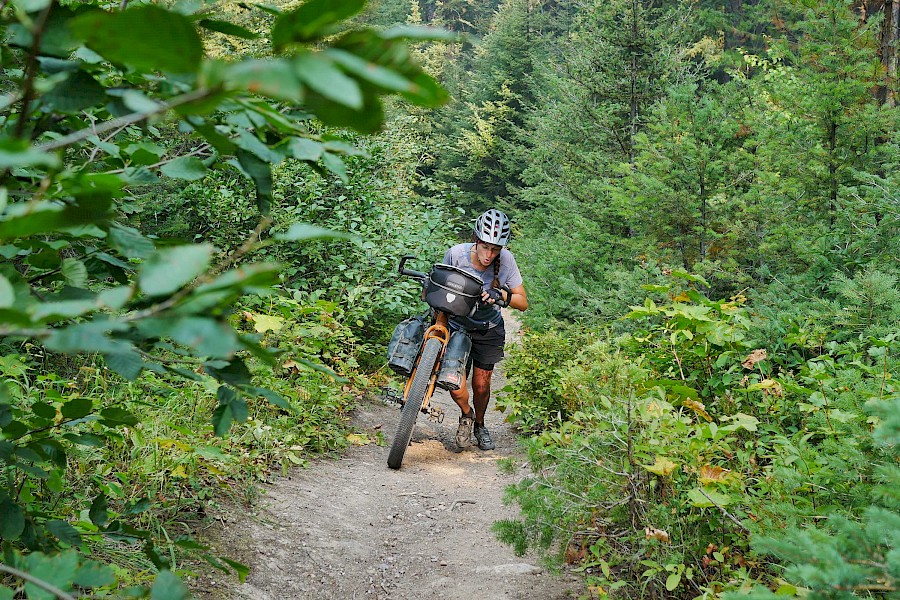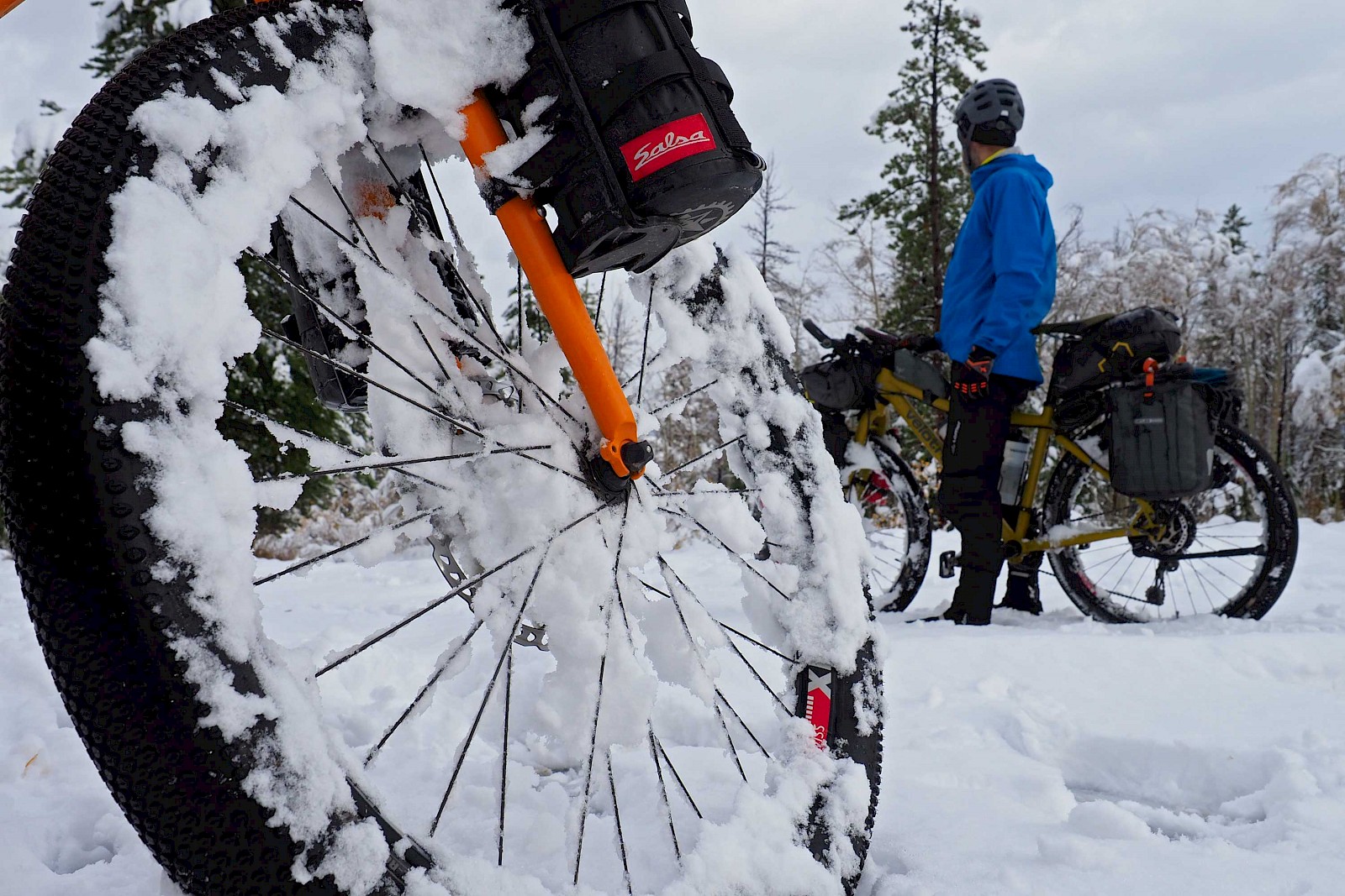 Fast ausschließlich auf einsamen Forststraßen und einigen herausfordernden Trail-Passagen geht es in sieben Tagesetappen bis zur Grenze in die USA, wo wir aufgrund der verheerenden Waldbrände in Montana einige Umwege nehmen müssen. Nach einem Monat „Schönwetter-Radeln“ erreicht uns im Yellowstone Nationalpark schließlich ein viel zu früher Gruß des Winters. Gerade noch radeln wir im kurzen Shirt durch die Rauchwolken der mächtigen Waldfeuer in Montana, schon tragen wir alle Klamotten, die wir in den Taschen haben und kämpfen gegen den viel zu frühen Wintereinbruch in Idaho und Wyoming. Eine neue Herausforderung für unsere FINDER! Drei Wochen lang kämpfen wir mit Nassschnee, verschlammten Pisten und Regen. Viel Regen. Unsere FINDER stoßen teilweise an ihre Grenzen, was aber angesichts der teils miserablen Bedingungen kein Minuspunkt sein soll. Selbst mit einem ausgewachsenen Fatbike wäre hier oft Schluss gewesen!