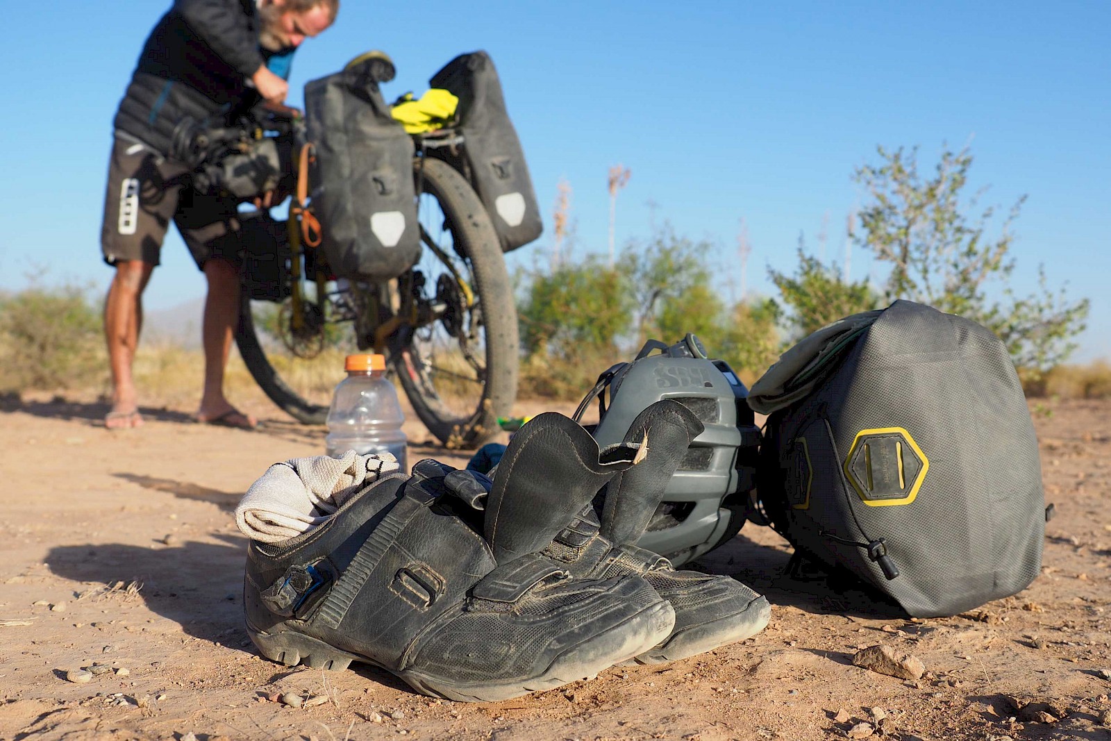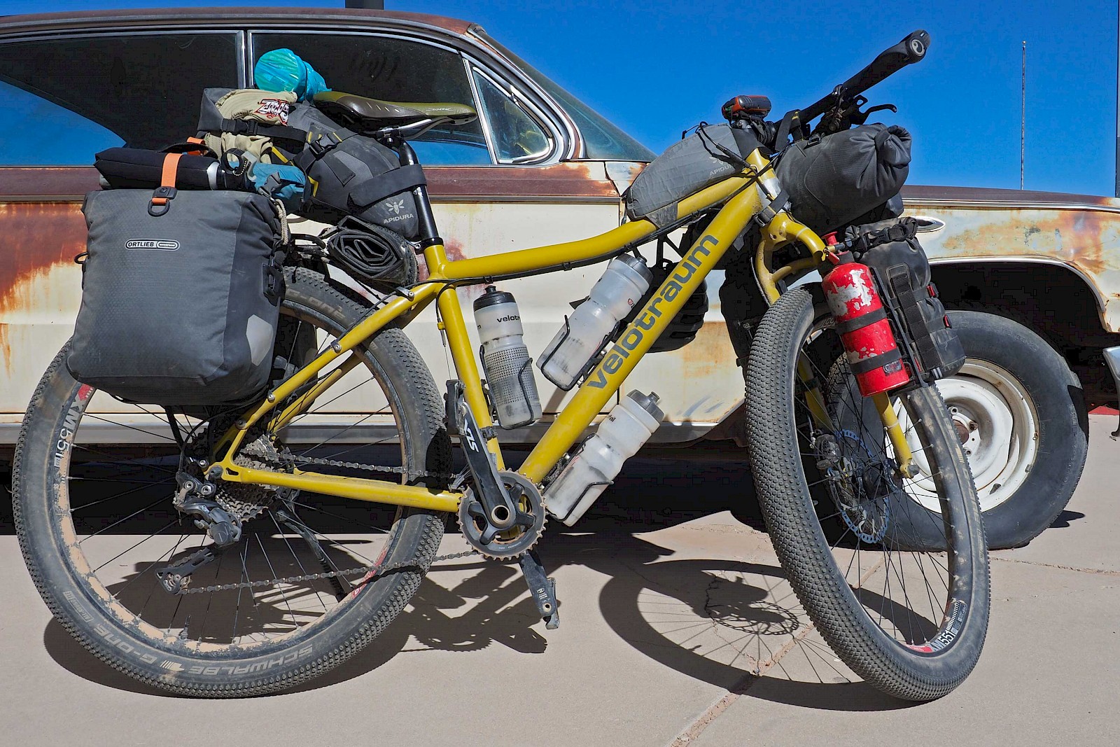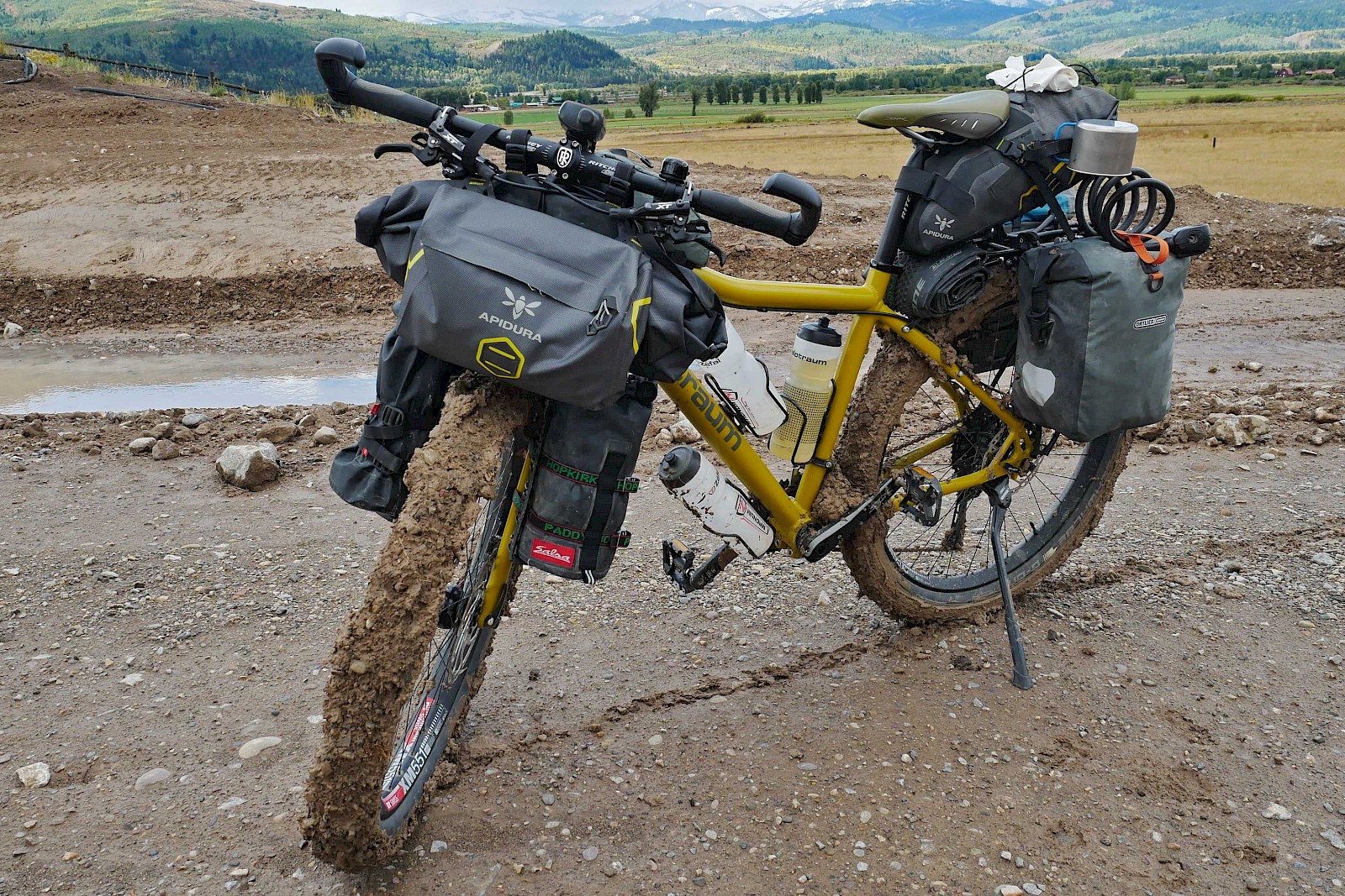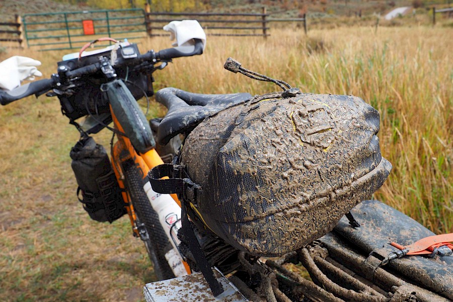 Wir hatten die Qual der Wahl: Klassisches Touren-Setup mit viel Volumen oder puristisches Bikepacking? Mit einem klassischen Packtaschen-Setup wird aus deinem Rad schnell ein träger Lastesel, welcher nur wenig Fahrspaß abseits des Asphalts bietet. Beim Bikepacking bleibt man hingegen leicht und agil, verliert jedoch massiv an Pack-Volumen und Flexibilität. Da wir aber oft für mehrere Tage autark sein mussten, eine recht üppige Fotoausrüstung mit dabei hatten und nicht auf vollwertige Lebensmittel verzichten wollten, entschieden wir uns schlussendlich für eine Hybridlösung: Bikepacking-Taschen von Apidura (Saddle Bag, Lenker-Rolle, Gas Tank), Salsa-Cages mit den dazugehörigen Packsäcken an der Vordergabel, sowie Ortliebs neue „Gravel Pack“ Taschen am hinteren Gepäckträger. Mit 53 Liter Volumen pro Person mussten wir auskommen. Ein Ansporn mehr, nur das Wesentlichste einzupacken!