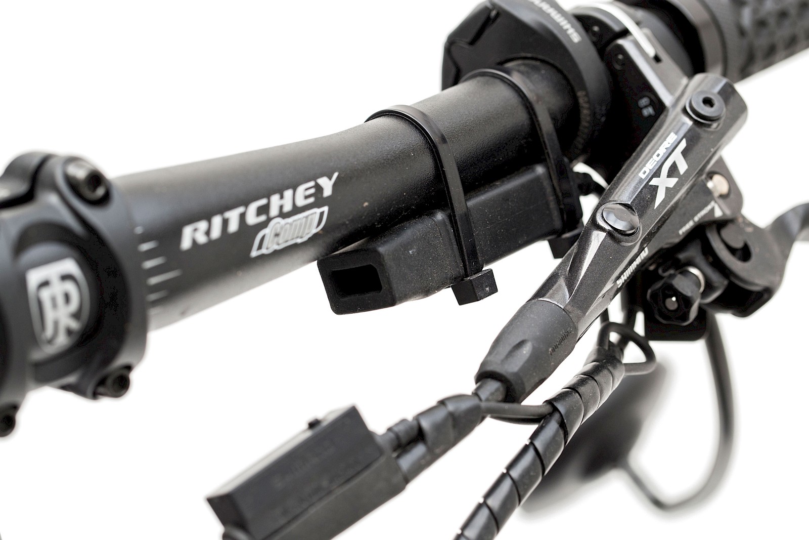 Ein durch und durch pragmatisches Nutzrad – Dem FD2E von Moritz liegt ein ungewöhnliches und umfangreiches Pflichtenheft zu Grunde. Denn eigentlich ist das Rad für seine Frau Ina, die damit täglich 30 Kilometer zur Arbeit pendelt. Allerdings sollte das Rad auch mal g’schwind von Moritz zu benutzen sein. Die Lösung für die gewünschte adhoc-Anpassung: Eine verstellbare Sattelstütze von Giant, die in den jeweiligen Endpositionen die richtige Sattelhöhe aufweist. Auf ein Display wurde bewusst verzichtet, als Ersatz fungiert das minimalistische EW-EN100; bei Bedarf kann ein Smartphone als Displayersatz damit gekoppelt werden.
