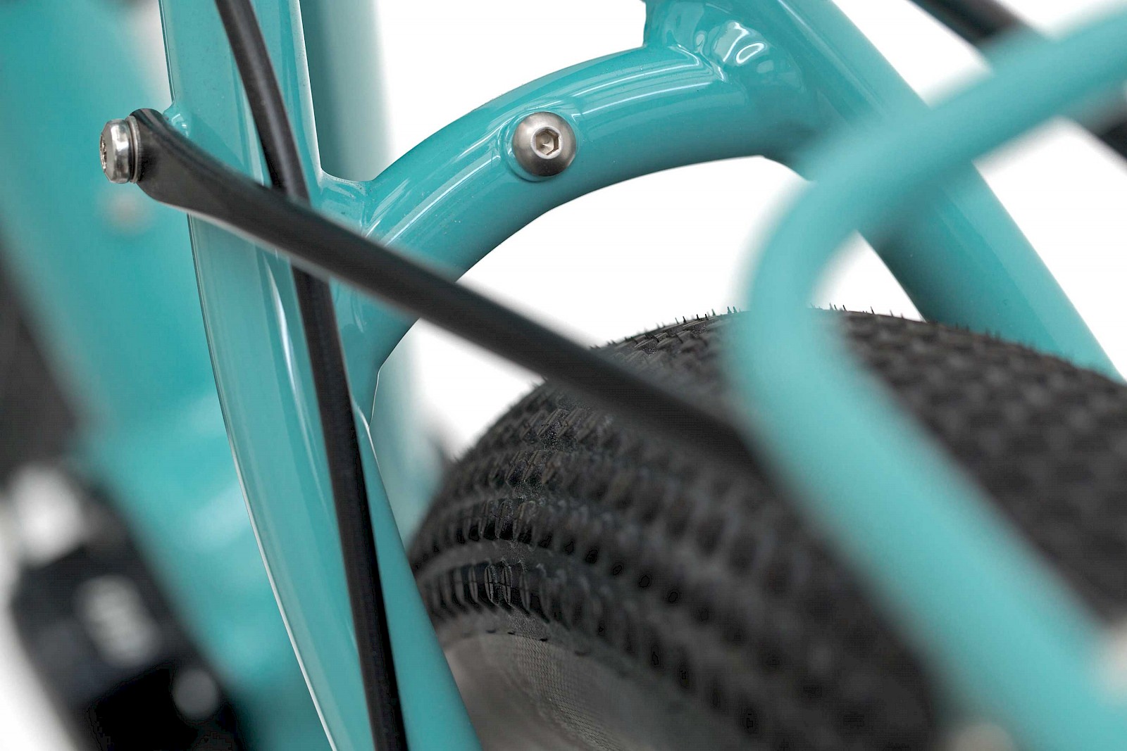 Neben der optimalen Abstimmung auf das Pinion-Getriebe, ist die Skalierbarkeit des Reifenformats ein herausragendes Merkmal des FD-1300. Je nach Einsatzbereich und persönlichen Vorlieben lassen sich 27,5-Zoll-Reifenformate im ETRTO-Maß 55 bis 70-584 verwenden (26-Zoll-Fans müssen 62-559 aufziehen). Unabhängig davon, ob es sich um richtige Stollenreifen – die deutlich breiter bauen – oder schwach profilierten Reifen wie dem Super-Moto-X handelt. Damit lässt sich vom normalen Alltags-, Touren- und Reiseeinsatz bis zur abenteuerlichen Non-Pavement-Bikepacking-Tour so ziemlich alles bewältigen.
