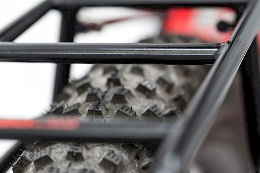 Bei genauerer Betrachtung erkennt man unschwer die Verwandtschaft zu den Modellen »Cargo« und »Logo«. Der Grand-Expedition verkörpert sozusagen eine Symbiose aus den beiden Tubus-Erfolgsmodellen. Wahlweise können die Packtaschen oben oder unten eingehängt werden (Logo-Gene) und der Träger bietet oben eine breite Auflagefläche mit vorderem Anschlag (Tubus-Gene). Bohrungen für die Innenverlegung des Lichtkabels sind nun auch vorhanden, wenn auch noch nicht an allen Stellen, die wir gerne hätten.