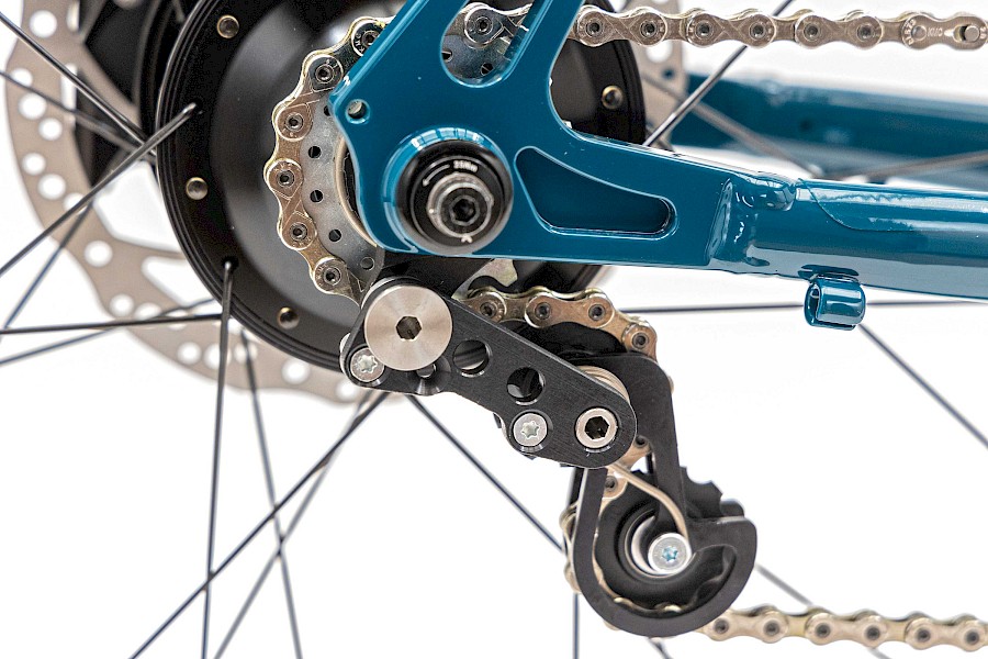 - Da wäre zunächst der Kettenspanner. Da der S100-Rahmen weder Exzenter noch verschiebbare Ausfallenden hat, ist ein Kettenspanner unverzichtbar. Früher hätte uns das auch wahnsinnig gestört, inzwischen sind wir da gelassener und weniger verbohrt, zumal der Kettenspanner den Wartungsaufwand eher verringert, da die Kette nicht nachgespannt werden muss. Außerdem spart man am Rahmen rund 200 Gramm Gewicht, ohne an Belastbarkeit oder Steifigkeit einzubüßen.