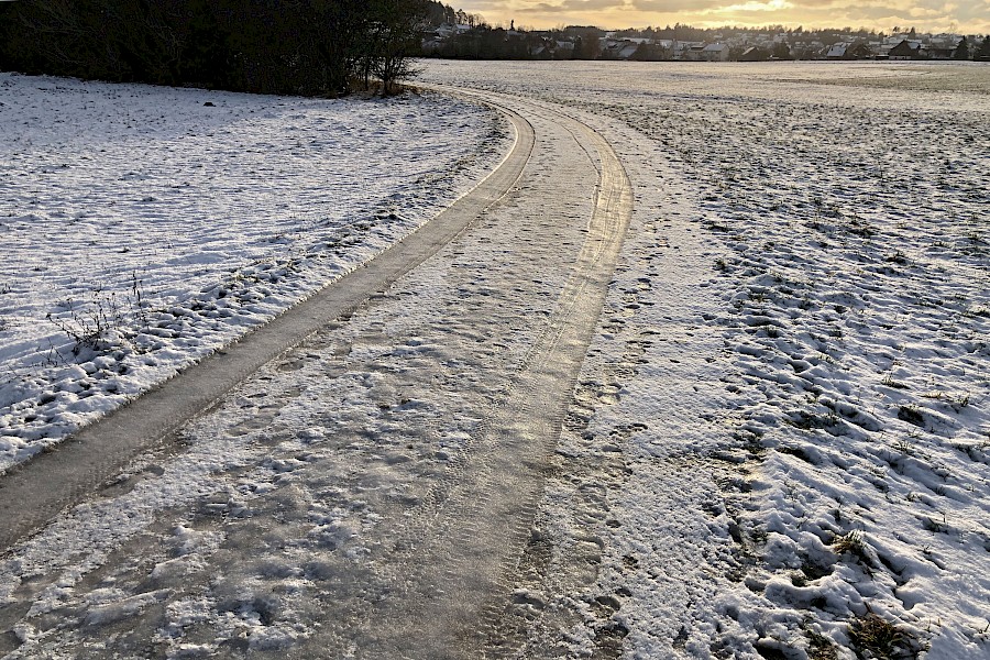 Die Wetterprognose sollte recht behalten. Tauwetter, Schneeregen und strammer Nachtfrost sorgten auf meiner Arbeitsstrecke für eine fast »durchgängige« Eisdecke, von der Haustür bis zum Ende des Radwegs in Weil der Stadt. Ich bin zwar nicht mehr »entspannt« unterwegs gewesen, da fehlte mir unter so extremen Bedingungen doch noch das Vertrauen in und die Erfahrung mit dem Reifen, aber ich bin sicher und ohne einen einzigen Ausrutscher im Betrieb angekommen. Das größte Risiko war das Anhalten und Absteigen um die Bilder zu machen ;-)