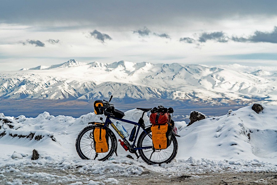 Durch einsame verschneite Landschaft fahre ich am nächsten Tag langsam aber stetig von 2200 Metern über Meeresspiegel wieder auf über 3100 hoch. Oben angekommen hat es eisige minus acht Grad Celsius. Auf der Abfahrt liegt teilweise Eis, teilweise Schnee. Ein guter Moment um meinen »wunderbar breiten« Reifen (Zitat Stefan Stiener ;) ) zu danken. Die Luftfeuchtigkeit meines Atems kondensiert in meinem Bart und gefriert anschließend. Allgemein kann man sagen: es wird unangenehm kalt in Kirgistan.