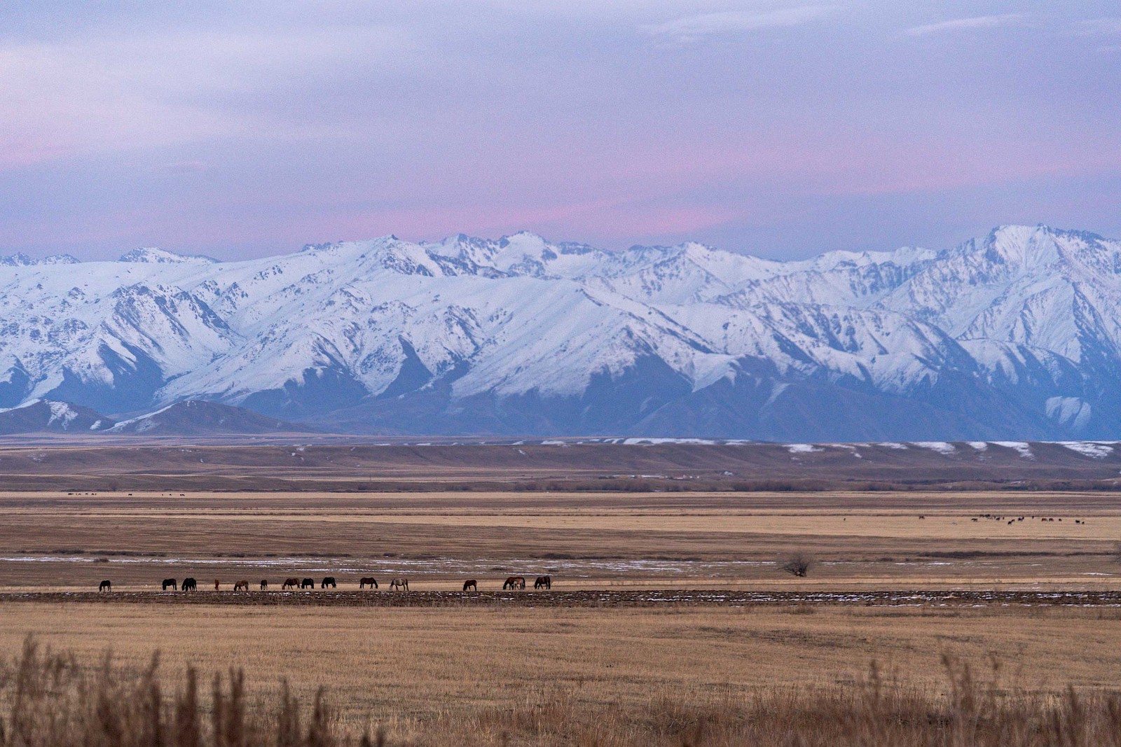 Der kleinste der 14 Gänge meiner Rohloff-Schaltung ist über 2 Tage mein bester Freund und weicht mir nicht von der Seite – bis zum Scheitel des Töö-Passes auf 3.180 Metern über dem Meeresspiegel. Das stimmt nicht ganz. Die letzten drei Kilometer darf ich nicht selber fahren laut Polizei. Vor dem Tunnel am Ende des Passes muss ich anhalten und mit einem Pferde-Transporter mit fahren. Dass es kein normaler LKW ist, sondern ein Pferde-Transporter, ist so typisch Kirgistan, dass es schon wieder lustig ist. Aus dem Tunnel heraus blicke ich über die schöne Abfahrt der Passstrasse ins Suusamyr-Tal. Tschüss erster Gang, hallo größere Übersetzung. Mit der typischen Post-Pass-Euphorie geht es die Abfahrt herunter und in den Sonnenuntergang. Pferde auf Wiesen und Berge, welche der Schnee zu erst weiß und die Sonne anschließend orange färbt. Herrlich. Für morgen steht wieder eine Tour über 3.000 Meter Höhe auf dem Plan, deshalb endet der Tag ziemlich bald nach Sonnenuntergang.