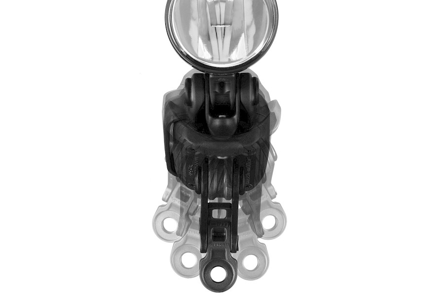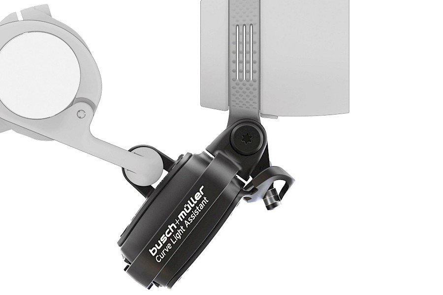 Der siebenfach kugelgelagerte Busch + Müller-Kurvenlicht-Assistent für E-Bikes sitzt zwischen Halter und Scheinwerfer und lässt sich wahlweise an der Gabelkrone oder am Lenker montieren. Beim Losfahren justiert sich die Vorrichtung selbst. Der Assistent ist mit beinahe allen E-Bike-Scheinwerfern kompatibel – nur durch das Gewicht der Leuchte sind Grenzen gesetzt. Bei Velotraum wird er mit einem Busch + Müller-Scheinwerfer montiert (mit dem B + M IQ-XM E gibt es noch die Fernlicht-Funktion dazu), genauso gut eignet sich aber auch die Kombination mit unseren SON-Scheinwerfern.