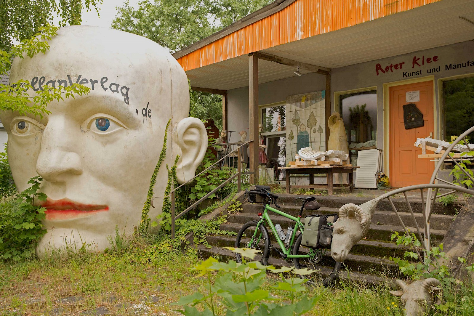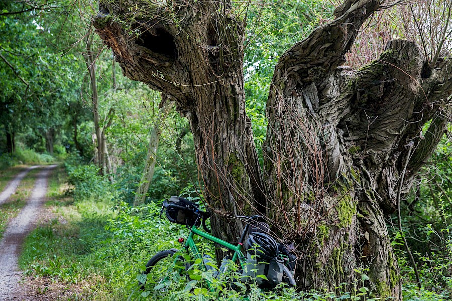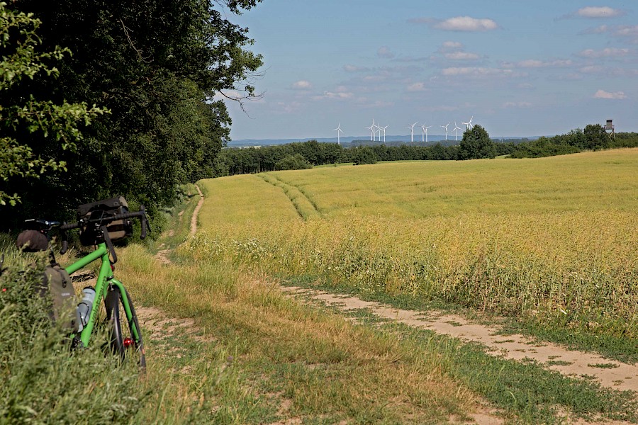 Nach einem guten Frühstück musste ich von Angermünde zunächst wieder auf den Radweg zurück. Erwartet hatte ich eine langweilig-beliebige Transferstrecke, zu meiner Überraschung war es zwischen Angermünde, Herzsprung, Neukünkendorf bis nach Stolpe sehr, sehr schön. Die Wege, die Landschaft, die Vegetation und die skurrilen »Fundstücke« verbinden sich zu einem famosen Ganzen. Den stimmigen Anschluss bildet der kleine Ort Stolpe mit seinem Gras-umwogten Festungsturm samt schöner Aussicht auf das weite Odertal.
