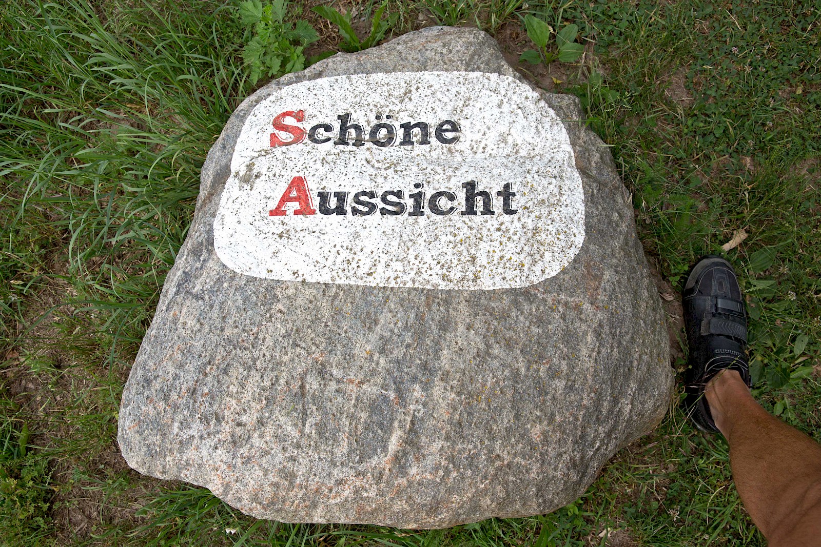 Dafür war der weitere Streckenverlauf sehr abwechslungsreich und mit vielen kleinen Überraschungen gespickt. Nach Lichtenberg – da schwirrt mir doch gleich der Zauberberg durch den Kopf, obwohl der Ort überwiegend aus Biogasanlagen besteht – ging es ins Naturschutzgebiet rund um die den Kurort Feldberg umgebenden Seen. Eine herrliche Gegend. Den Auftakt machte ein liebevoll angelegter Waldpfad des Seehotels Lichtenberg – schon Thomas-Mann-adäquater. Das Lichtenberger Strandbad war verwaist; später traf ich immerhin noch zwei wetterfeste Paddler. Auf schattigen Waldwegen kam ich schließlich bis nach Feldberg, einem lebhaften und gut ausgestatteten Kurort, in dessen Kurcafé ich dann den schlimmsten Nieselregen aussaß …