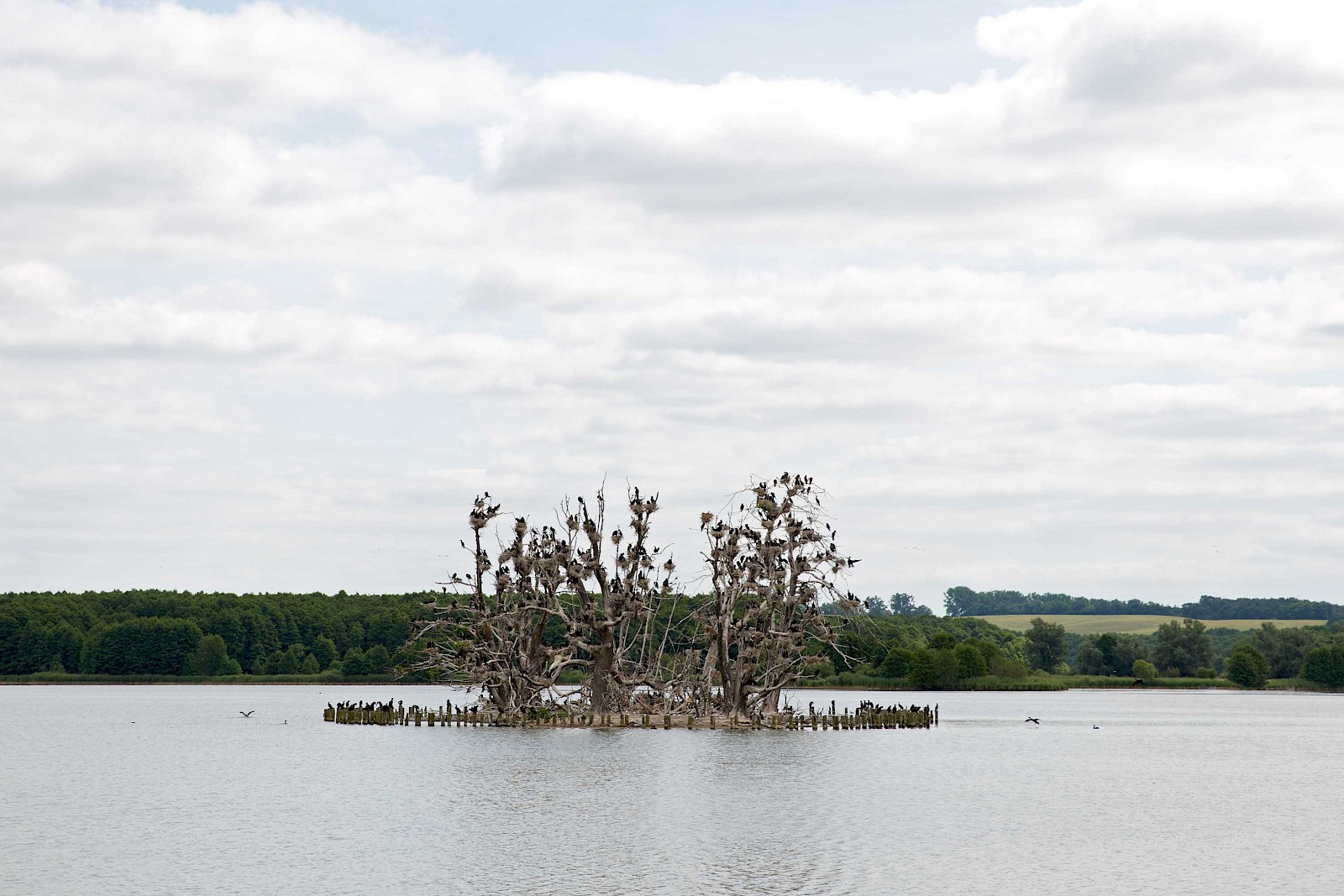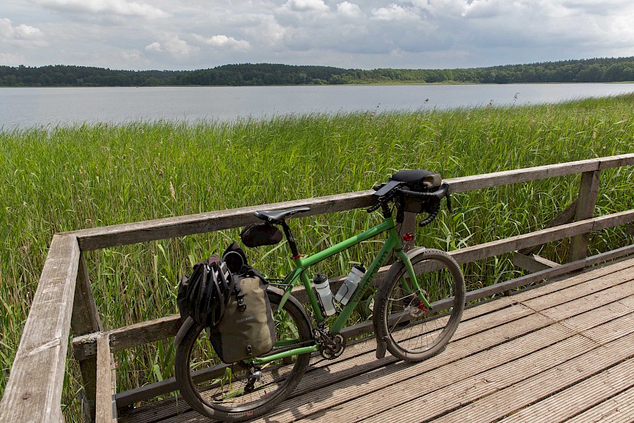 Scheiß Schotterstraßen – Vom Müritz-Nationalpark habe ich nicht viel gesehen, aber viel gespürt. Während die schmalen Kieswege gut zu fahren sind, waren die breiten Pisten vor und nach Klockow auf die Dauer sehr strapaziös: Schlaglöcher plus Wellblech. Dazu auch noch ein Plattfuß am Vorderrad, immerhin direkt am Käbelicksee, da wurde aus der Reparaturpause gleich noch eine Badepause.