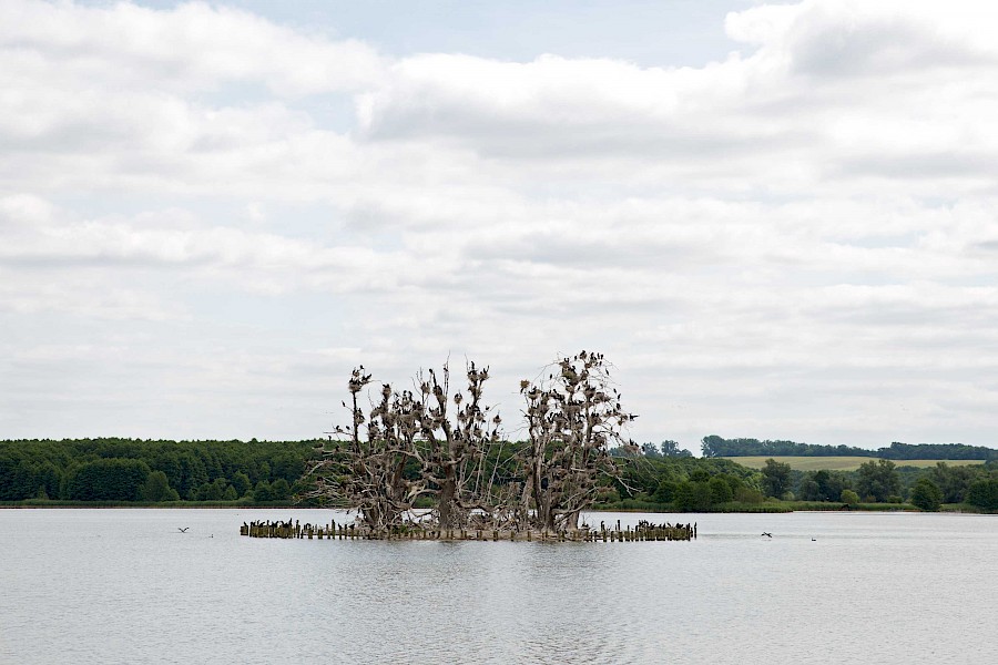Das Wetter hatte sich etwas gebessert, also rasch gefrühstückt und ab aufs Rad. Bei Morgensonne ist Neustrelitz in der Tat deutlich attraktiver – mea culpa. Zuerst radelte ich an den unvermeindlichen Ausfallstraßen entlang – welch ein Lärm. Dann ging’s auf lange und abenteuerlich Kies- und Sandwege, die durch herrliche Wälder führten. Sehenswert ist der Park in Hohenzieritz, Sterbeort der Königin Luise von Preußen. Ein paar Pedaltritte weiter liegt das Jagdschloss Prillwitz am See, mit Badestelle und bizarrer Vogelinsel. Sehr abwechslungsreich, nur vorankommen geht anders … Immerhin sah ich heute auch mal andere Reiseradler. Was ebenfalls auffällt – MeckPomm ist wohlhabender geworden: die Neubaugebiete sind ähnlich nichtssagend-beliebig wie bei uns ;-)