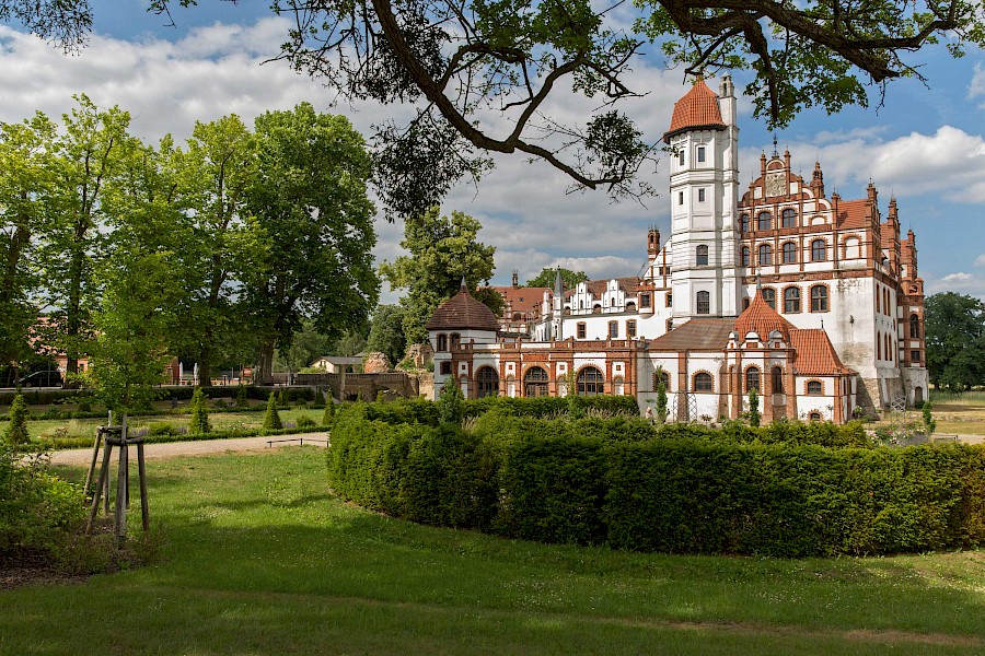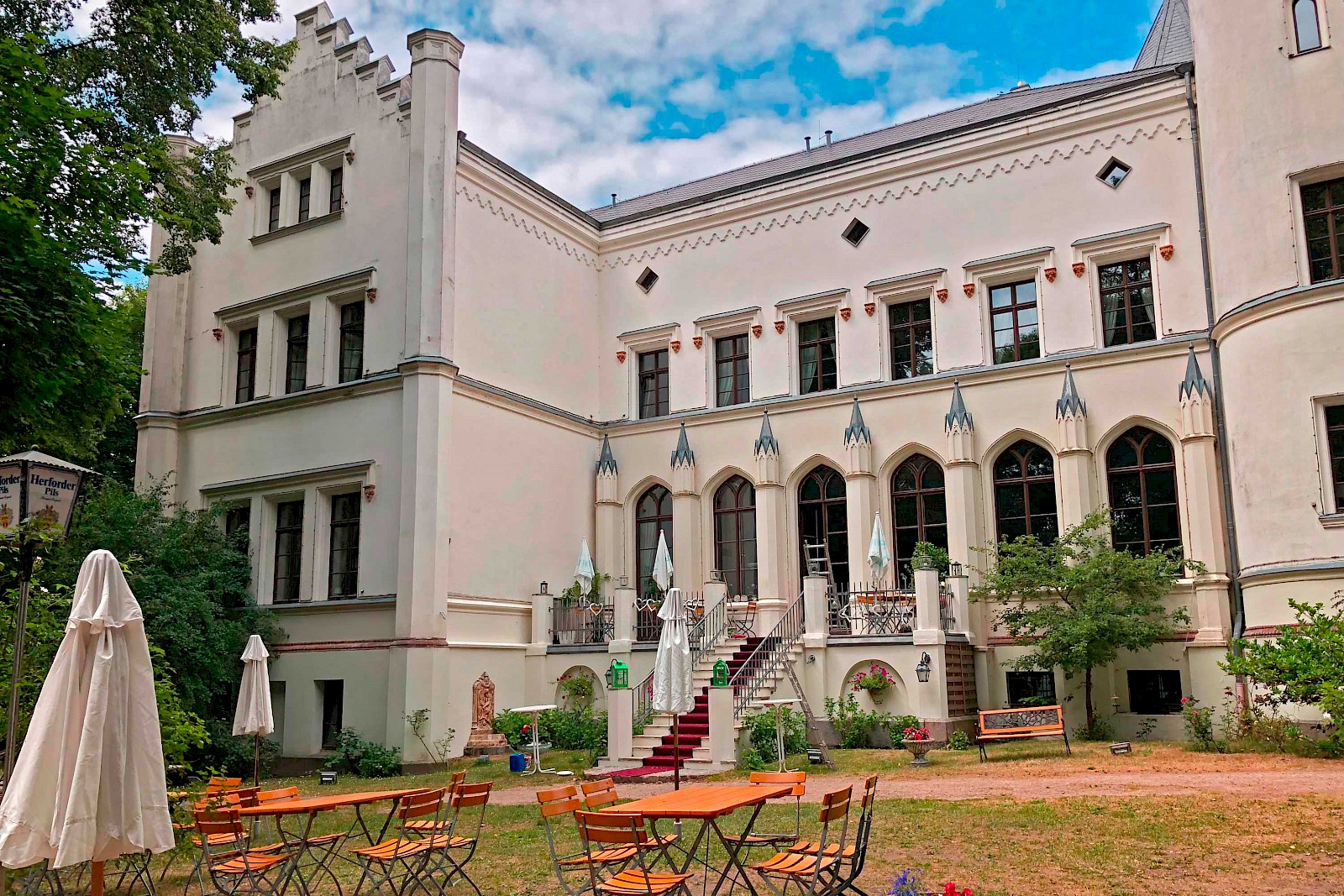 Die nächste Pause machte ich ganz spontan im Schlosshotel Berdenfelde, einem herrschaftlichen Gutsgebäude im Tudorstil; dabei hatte ich das Schloss für mich allein. Ähnlich wie bei Berdenfelde steht man als Reisender nach Wald, Feldern und kleinen Dörfern plötzlich im »Schloss-Dorf« Basedow – einfach »wow«. Auf einer Bank im Schlosspark ließ ich das Ganze beim Müsliverzehr auf mich wirken.