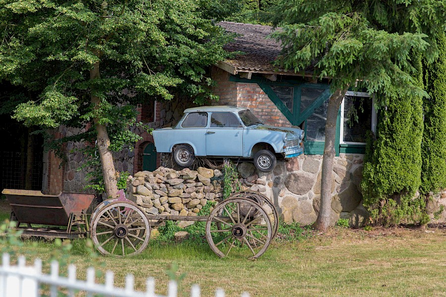 Die letzten 35 km sollten unangenehm und holprig werden. Zirka 15 km Schotterstraße mit Wellblech dazu Nieselregen. Mir reichte es inzwischen, und so bekam die unschöne Streckenvariante über Altstrelitz nach Neustrelitz ihre Längen. Überhaupt, in einem Mittelzentrum wie Neustrelitz wird klar: im »Osten« und »Westen« fährt man in der Provinz Auto, egal wie niederschwellig und banal der Anlass ist. Immerhin, in dieser Hinsicht »ist zusammengewachsen, was zusammen gehört«.