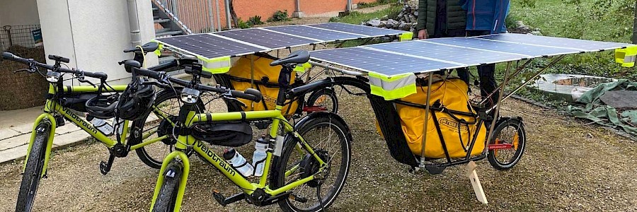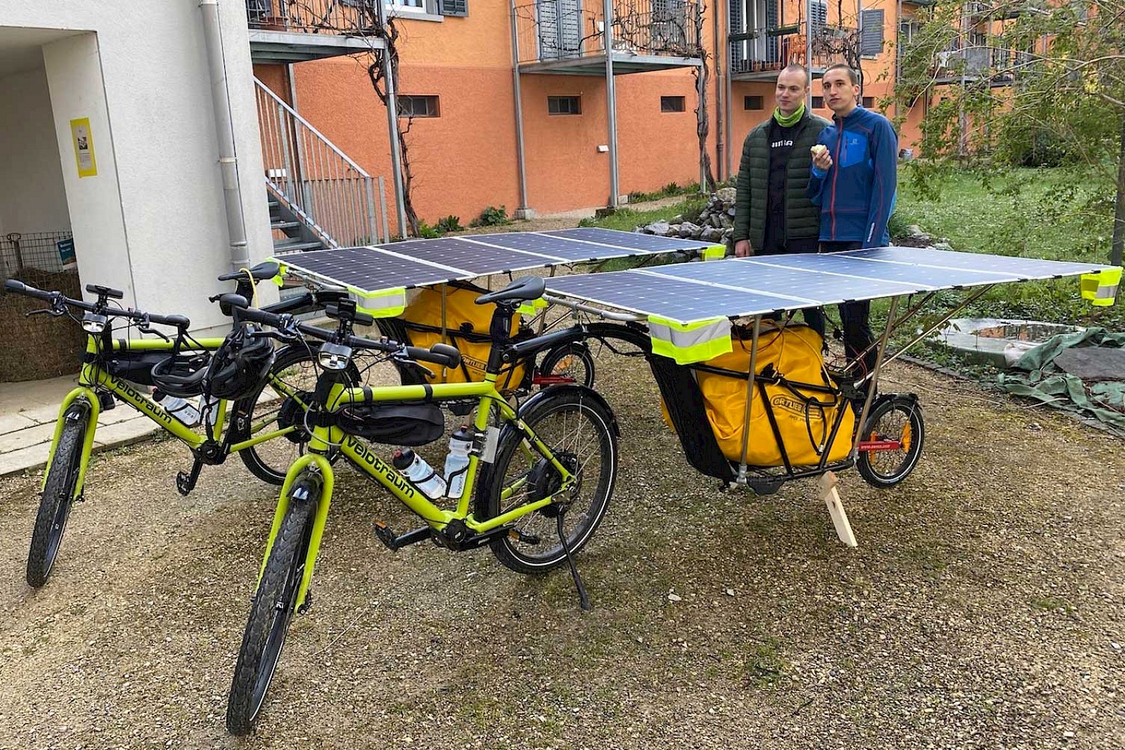 Wir sind zwei Studenten (Kaspar und Johannes) der ETH Zürich, die nächstes Semester ihr Studium abschließen werden. Wir sind beide passionierte Rennradfahrer und haben uns vorgenommen, nach unserem Abschluss in einem halben Jahr nicht weniger als einmal um die Welt zu radeln. Dafür bauen wir uns zwei durch Elektromotoren unterstützte Fahrräder. Der Motor soll dabei seine Energie aus Solarzellen beziehen, die an einem mitgeführten Anhänger installiert sind.