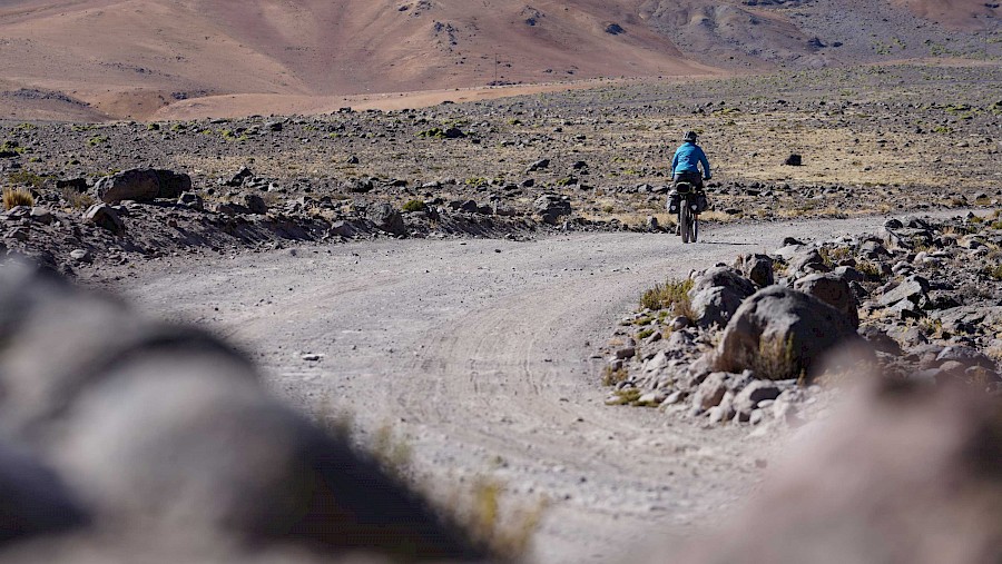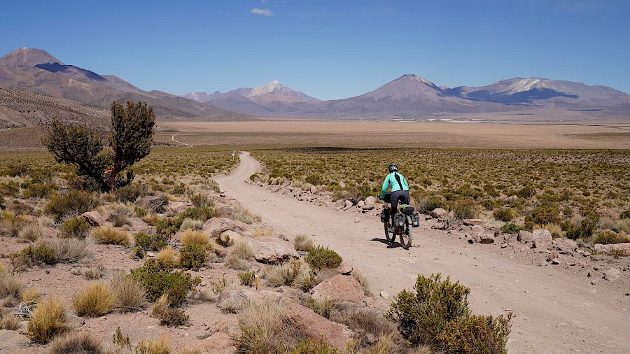 Als Alternative zur mittlerweile ziemlich überlaufenen „Lagunenroute“ ist uns bei der Recherche eine unter Bikepackern als Ruta de las Vicunas bekannte Etappe durch das nordchilenische Altiplano untergekommen. Auf knapp 300 Kilometern radeln wir auf meist einsamen Schotterpisten durch eine faszinierende Region. Links von uns reihen sich schneebedeckte Vulkane aneinander, wir beobachten fasziniert die spärliche Tierwelt des Altiplano. Vor allem erspähen wir scheue Vicuñas, die wilden Verwandten der Alpacas, aber auch putzige Viscachas, die aussehen wie ein Kaninchen mit langem Schweif. Dann und wann schwebt ein Kondor weit über unseren Häuptern durch die Höhen, Flamingos staken tollpatschig durch die salzigen Lagunen und als Highlight entdecken wir eines Morgens frische Pumaspuren unweit unseres Zeltes. Gänsehaut!