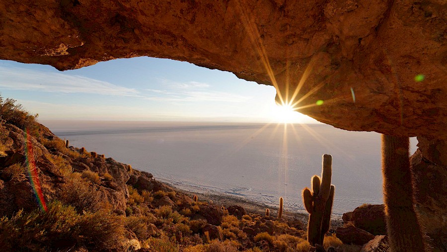 Der Salar de Uyuni ist mit seinen 10.000 Quadratkilometern die größte Salzfläche der Welt und sogar größer als das österreichische Bundesland Kärnten. Gemeinsam mit dem weiter nördlich liegenden Salar de Coipasa bildet er die Kulisse unserer letzten Etappe, die im Städtchen Uyuni enden wird. Die Querung der ersteren Salzpfanne erweist sich als äußerst ruppig. Etwa vier Stunden holpern wir schnurgerade über eine unregelmäßige, feuchte Salzschicht, die uns mehr als jede noch so miese Waschbrettpiste durchschüttelt. Vom Örtchen Tahua aus entern wir schließlich den legendären Salar de Uyuni. Diesmal ist die Salzfläche sehr gut zu befahren. Auf der von zahlreichen Fahrzeugen genutzten Spur düsen wir mit für unsere Verhältnisse rasanten 20 km/h zur „Isla Incahuasi“, einer aus versteinerten Korallen bestehenden Insel inmitten des ewigen Salzes. Auf der windabgewandten Ostseite finden wir eine kleine Viehpferch, die uns als Nachmittags- und Nachtlager dienen soll. Nur selten spaziert der eine oder andere Tourist an unserer temporären Behausung vorbei, wir haben die von jahrhundertealten Säulenkakteen bewachsene Ostflanke der Insel fast für uns alleine. Richtig magisch wird es zur Abenddämmerung, die die Landschaft in ein unbeschreibliches Bild verwandelt. Die gigantischen Kakteen scheinen zu glühen, auf der unendlichen Salzfläche zeichnen sich kontrastreich die regelmäßigen Hexagon-Muster ab. Nach einem ebenso grandiosen Sonnenaufgang flitzen wir mit Rückenwind die 70 Kilometer bis ans Ostufer, von wo es nicht mehr weit nach Uyuni ist.