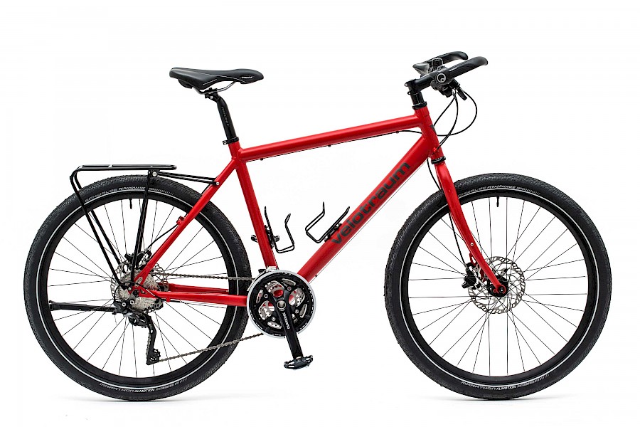 KONZEPT VK3 – Nackige Fahrräder – also ohne Schutzblech und Lichtanlage – werden bei Velotraum eher selten in Auftrag gegeben, sogar beim »Speedster« und »Finder«. Kurzum, so ein VK3, mit kleinem Tubus-Vega-Gepäckträger fällt optisch aus der Reihe. An der leicht andersartigen Silhouette ist aber auch noch das Reifenformat beteiligt. Einen Schwalbe Almotion in 55-584 würde man eher im »Finder« vermuten.