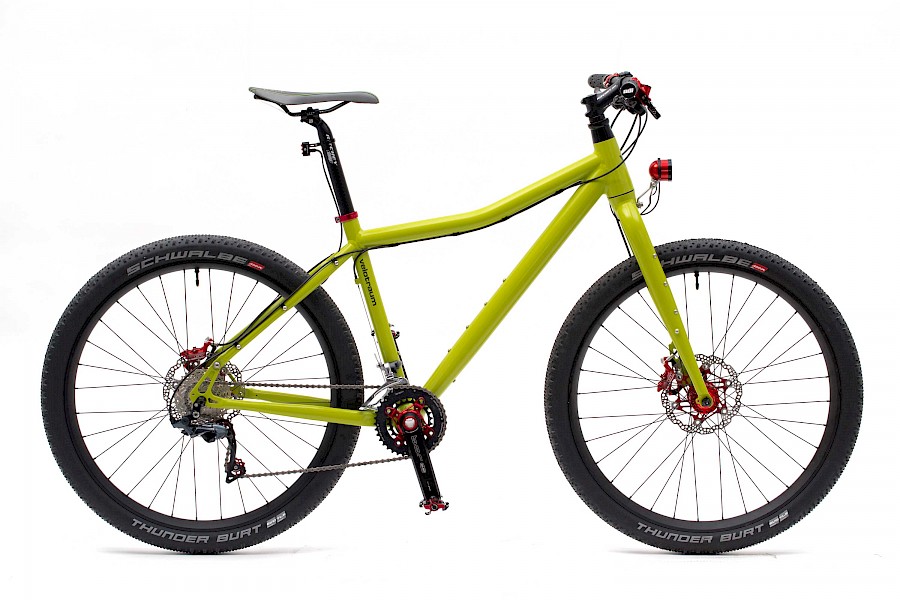 Der vorläufige Komponenten-Status von Mathias’ Finder setzt sich zusammen aus Hinterradnabe und Bremse von Hope, einer SON-Lichtanlage mit Supernova-Rücklicht und einem Antrieb von »b.o.r«. Als Reifen hat sich Mathias für den Thunder-Burt in 57-584 entschieden, natürlich in tubeless. Lohn der Mühe: ein leichter Blickfang mit 11,9 Kilogramm Gewicht.