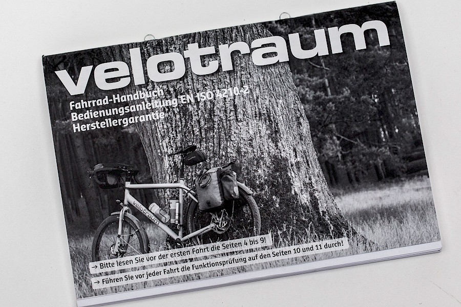 Als nun eine Wiederauflage anstand, haben wir uns entscheiden, die Velotraum-spezifischen Inhalte von den allgemeinen Inhalten zu trennen. Sprich, in Zukunft gibt es das Velotraum-Begleitheft und das Fahrrad-Handbuch nach EN/DIN und Schlag-mich-tot. Damit können wir in Zukunft flexibler auf notwendige und sinnvolle Änderungen reagieren und müssen uns nicht in das Korsett der »EN ISO 4210-2« zwängen lassen. Auf kompakten zwölf Seiten bietet unser Fahrrad-Begleitheft die wichtigsten Informationen und Hinweise zu unseren Fahrrädern und deren Nutzung. Die zwölf Seiten sollte sich jeder Velotraum-Fahrer unbedingt zu Gemüte führen – quasi Pflichtlektüre, frei nach dem Motto: Das schaffst Du ;-)