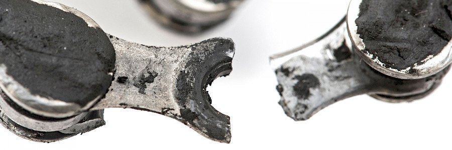 Die Kette stammt aus einem FD2E-Pedelec, das nur gefahren – gerne im Wiegetritt – und nur sehr wenig gewartet wird. Zudem wurde die Kette weit über die Verschleißgrenze hinaus gefahren, so zirka 4.000 bis 5.000 Kilometer hatte diese Kette auf dem Buckel. Woher wir das so genau wissen: Die Kette stammt aus dem Fahrrad des Chronisten …