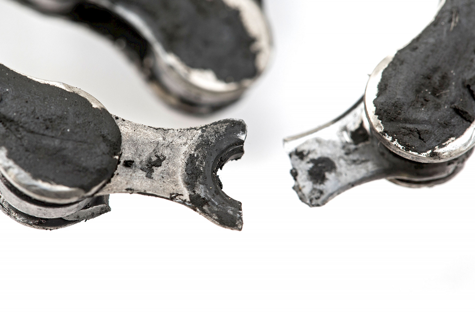Etwas einfacher ist die Einschätzung der gerissenen Kette. Hier sind die Innenlaschen bei einer Shimano HG701-Kette gebrochen, wahrscheinlich eine Kombination aus Ermüdungs- und Gewaltbruch. Ein extrem ungewöhnliches Schadensbild, denn meistens »reißt« ein Kette nicht, sondern es geht eine Nietstelle auf. Dabei verschlechtert sich im Vorfeld das Schaltverhalten, so dass man ein Chance hat, den Schaden zu bemerken.