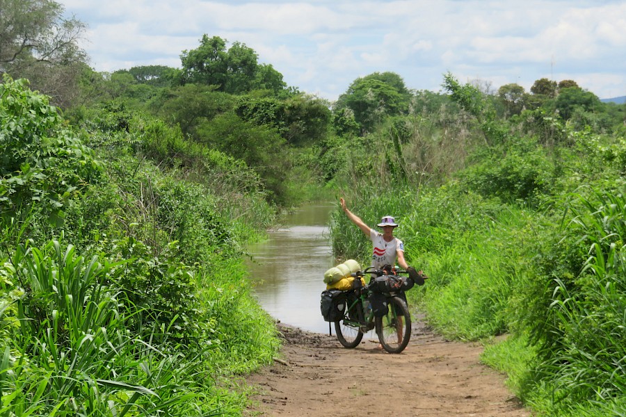 Und als die Flüsse schließlich bauchnabeltief werden, kommen wir in den Genuss, unser 17kg Rad samt Frontloader und Lenkerbehang auch mal zu schultern und die Backroller und Proviantsäcke extra ans ans andere Ufer zu befördern. Es funktioniert, die breiten Alurohre bieten die selbe angenehme Auflagefläche wie unsere Mountainbikes, aber auch wenn unsere Schultern und Nerven aus Stahl immer noch den einen Fluss mehr aushalten würden sind wir heilfroh, als da plötzlich die erste Betonrampe anstelle einer Brücke und einige Kilometer weiter schließlich die so lange herbeigesehnte Asphaltkante auftauchen.