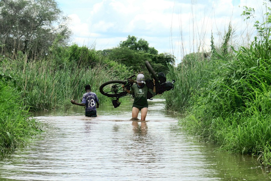 Auch in dieser Wildnis sind wir natürlich meist nicht alleine, aber wie auch zuvor auf uns selbst gestellt. Keine asphaltierte Hintertür, keine medizinische Infrastruktur und kein Wort Englisch werden uns hier im Ernstfall helfen. Die Landwirtschaft und Viehzucht betreibenden Einheimischen leben hier ein halbes Jahr lang mit und in den Schlamm- und Wassermassen, die sie von der sauberen Zivilisation trennen. Trotzdem finden sich immer wieder kleine Inseln der Rast in Form eines heruntergekommenen Schulgebäudes, unter dessen Vordach wir die Nacht verbringen, oder eines wasserdichten Strohdaches, unter dem wir gemeinsam mit den Dorfbewohner*innen einen plötzlichen Regenguss abwarten dürfen. Die Kinder hier sind auf während der Safarisaison offenbar zuhauf durchkommende weiße Gesichter dermaßen konditioniert, dass sie uns mit irren Blicken und nach »Sweets« schreiend verfolgen.