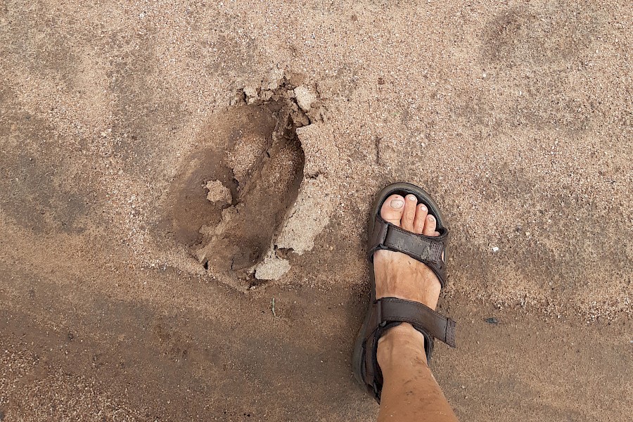 Doch dann wird es plötzlich gespenstisch still. Keine Dörfer säumen mehr unseren Weg, keine Rufe und Pfiffe hallen uns nach und Autos sind hier in dieser Jahreszeit ebenfalls kein Thema, aber wir begegnen einigen stark strapazierten und regelmäßig absaufenden Motorradfahrern und Die-Hard-Barfußradlern, die uns immer wieder die ein oder andere Umfahrung unpassierbarer Wegstrecken zeigen oder mit gutem Beispiel bei einer weiteren Flussdurchquerung vorangehen.