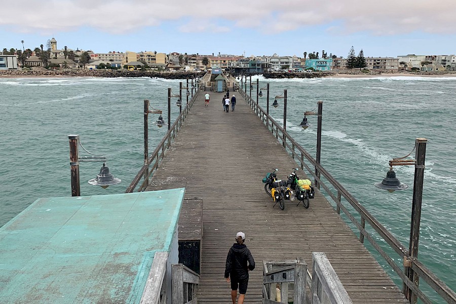 An der Namibischen Küste verbrachten wir eine rauhe, aber wunderschöne Nacht an einem abgelegenen Strand zwischen den Verdunstungsbecken der örtlichen Salzwerke, Schaaren von Flamingos und Pelikanen und dem wild rauschenden Ozean. Die Meeresluft brachte unseren Bremsen in nur wenigen Stunden die komplette Tonleiter bei und noch heute erinnern sich die Bremsbeläge an besonders taureichen Morgenden an das salzige Erlebnis.