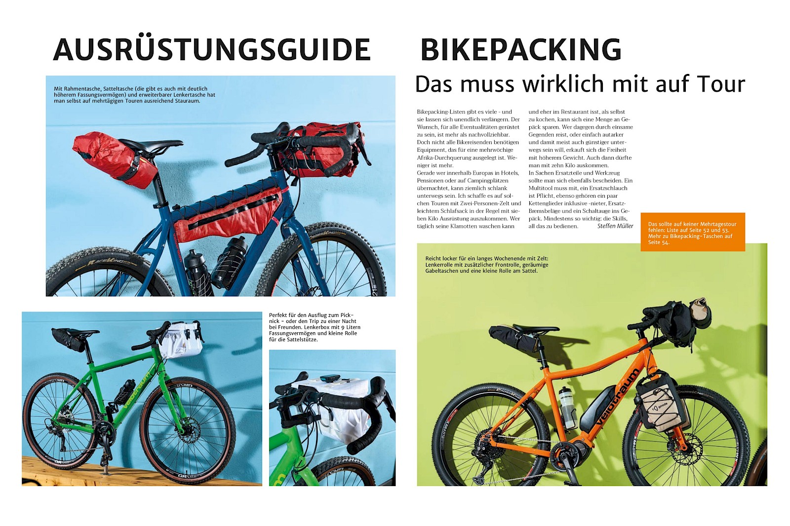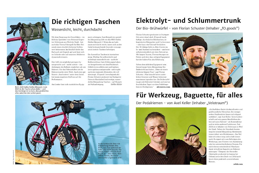 Florian Schuster von fO.goods, unser Partner für handgefertigte, individuelle Bikepacking-Taschen, kam auch noch dazu, um unsere Räder fotogen mit seinen Taschen zu schmücken und Journalist Steffen konnte sich obendrein noch ein paar persönliche Bikepacking-Tipps von Florian und Velotraum-Geschäftsführer Axel Keller abholen. Lest selbst auf Seite 52-57, auf welches Produkt die beiden jeweils nicht auf Radreise verzichten wollen.