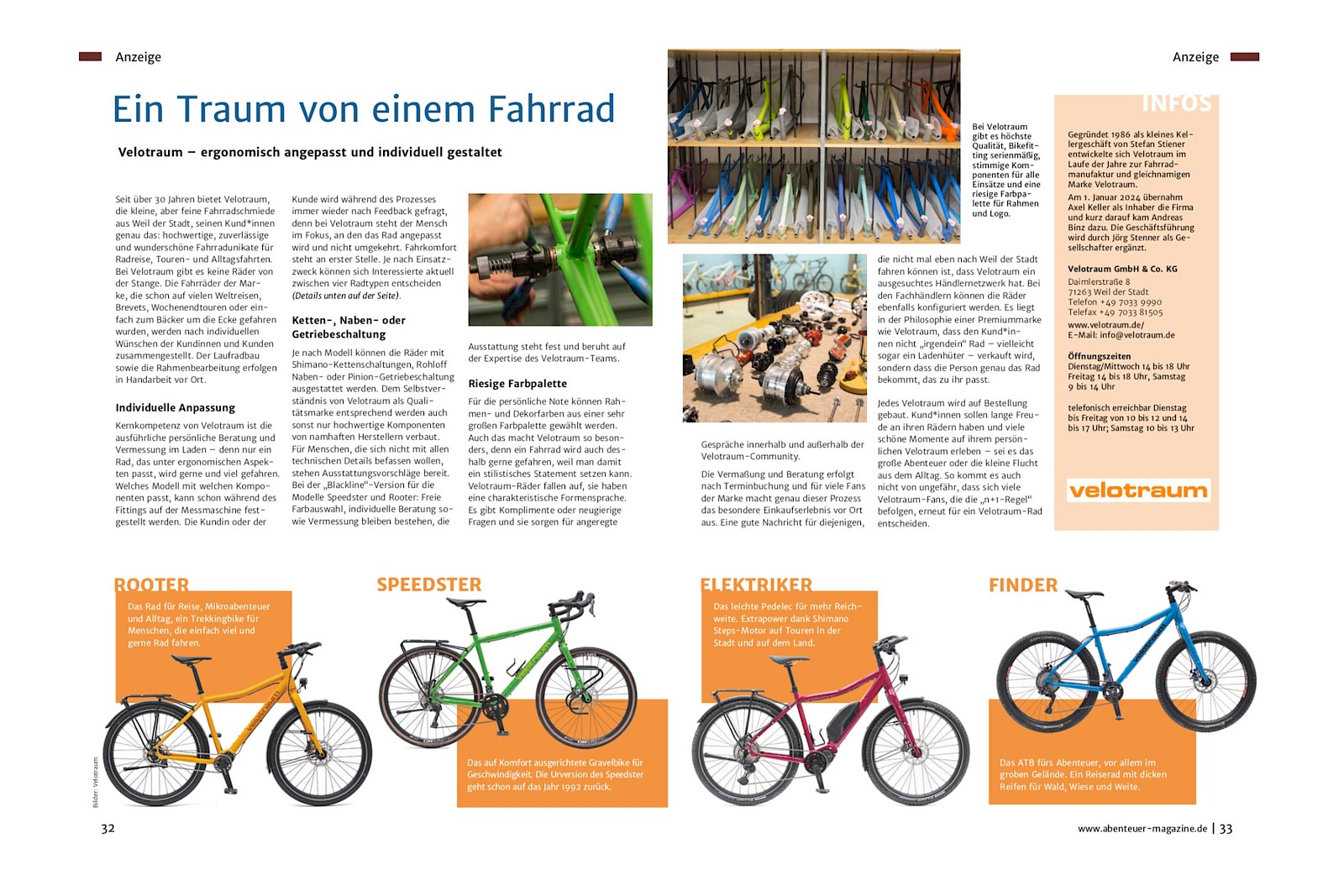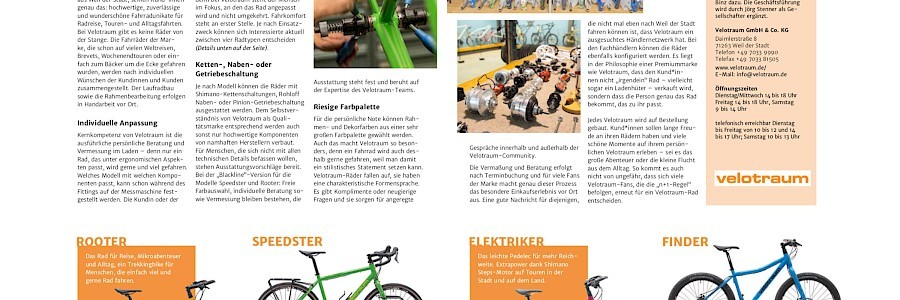 Außerdem haben wir auf den Seiten 32-33 ein Velotraum-Firmenporträt platziert, das unsere Philosophie und unser Sortiment prägnant zusammenfasst.