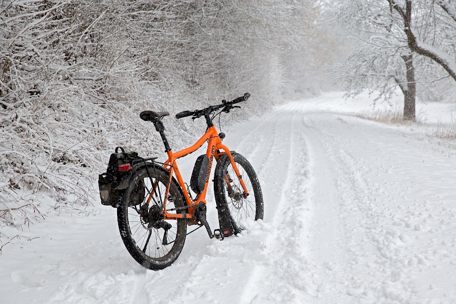 Über zwei Jahre bin ich täglich 36 km zu Arbeit gependelt. Seit dem verfüge ich über ein spezielles WINTERRAD. Als einziges meiner Räder hat es eine Shimano 7 Gangnabe mit Rücktrittbremse, die auch funktioniert, wenn die Felgenflanken vereisen. Die Nabe ist wirklich unverwüsstlich, Ersatzteile im Vergleich zur Rohloff geradezu ordinär preiswert. In der Ebene kommt man damit gut zurecht. Zusätzlich montiert ist ein chain glider als Kettenschutz. Ausserdem natürlich schwalbe spikereifen. (Nokian hatten sich augrund ihrer Pannenanfälligkeit nicht bewährt…habe noch nie in meinem Leben so gefroren!) Auf einen Gepäckträger habe ich verzichtet, weil ich finde, dass das Rad so besser ausbalanciert ist. Meine Sachen transportiere ich statt dessen in einem Ortliebrucksack, der zusätzlich den Rücken wärmt. Ich finde, dieses Rad hat sich sehr bewährt. Überfrierende Nässe, Glatteis oder eine geschlossene Schneedecke sagen wir mal bis 5 cm sind kein Problem. Der Moment der Kapitulation kommt, wenn der Schnee tiefe Fahrspuren aufweist und mehrfach überfriert.