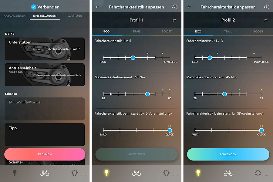 Die Bluetooth-Verbindung zwischen Smartphone und System klappt reibungslos, und Bedienungsfreundlichkeit und Verständlichkeit der App wurden ebenfalls verbessert – mit noch Luft nach oben. Wem sich angesichts der dort gebotenen Möglichkeit die Nackenhaare aufstellen – keine Sorge. Die Personalisierung ist ein »Kann« und kein »Muss«. Auch mit den voreingestellten Shimano- bzw. Velotraum-Parametern lässt sich prima klar kommen.