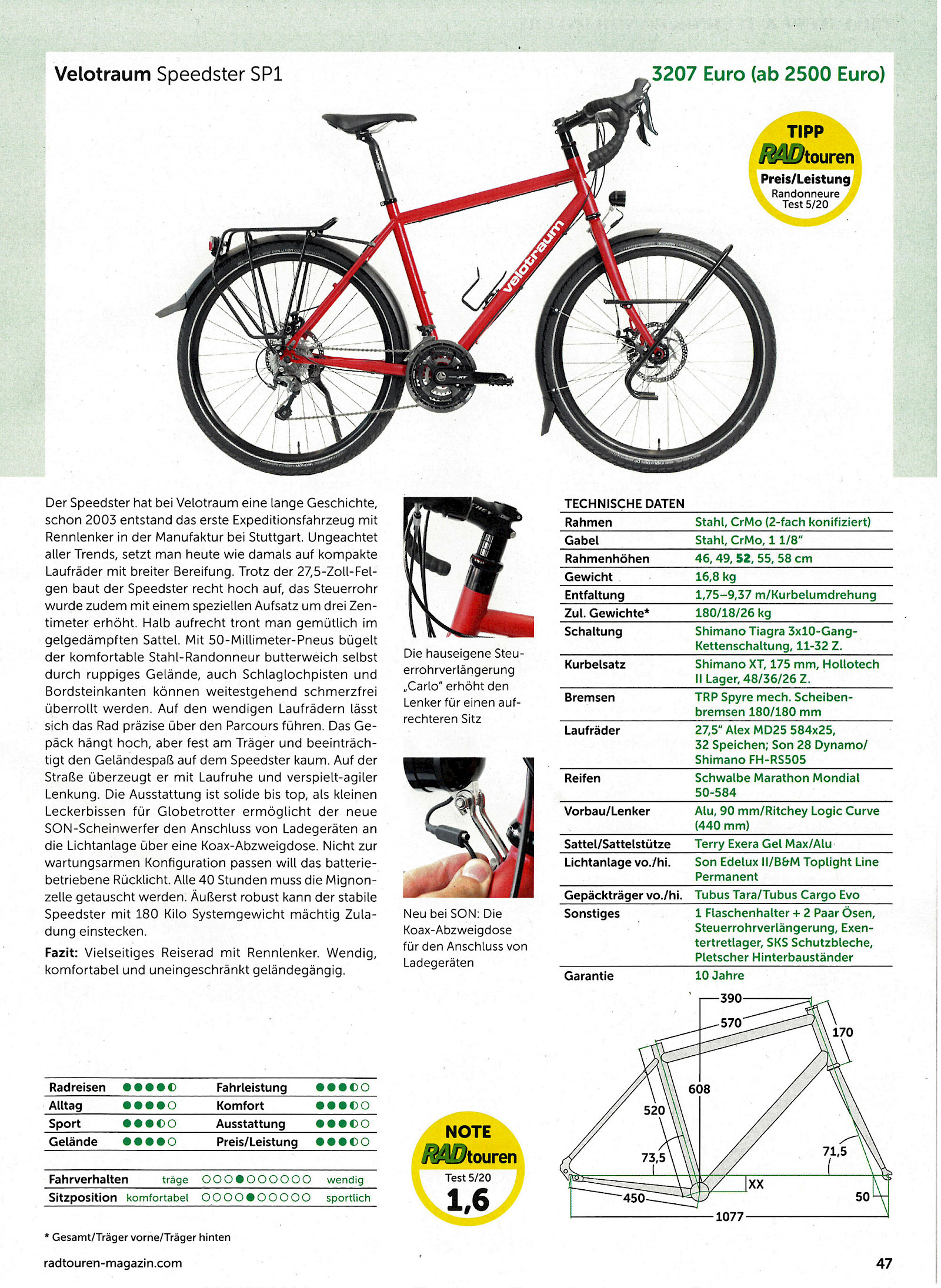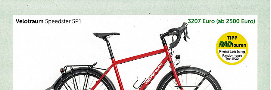 Da wir – für unsere Abläufe – sehr kurzfristig ins Testfeld gerutscht sind, kamen wir erst gar nicht in die Versuchung, einen ähnlich aufgerüsteten Randonneur (Speedster SP1 mit VT400-Stahlrahmen) ins Rennen zu schicken. Vielmehr musste ein am wenigsten benötigtes Ausstellungsrad die Velotraum-Flagge hochhalten, auch wenn wir um die Bewertungskriterien der RADtouren wissen (je hochwertiger die Ausstattung desto höher die Punktzahl). Damit hat es zwar nicht zu einer vermeintlichen Spitzenbewertung gereicht, doch wir freuen uns über diese eher ungewöhnliche Auszeichnung, denn nach wie vor umfasst unser Marken-Selbstverständnis auch das hochwertige Fahrrad mit pekuniärer Bodenhaftung ;-)