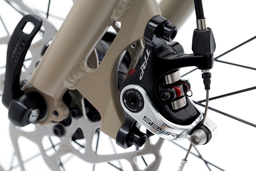 Doch genug geschimpft – Nach dem Eintreffen der ST-R7000-Schaltbremshebel aus der 105-Gruppe (nicht zu vergessen, auch die Felgen sind just mit ähnlicher Verspätung eingetrudelt), konnten wir nun endlich diese vakante Speedster-Variante für die Ausstellung aufbauen. Die Ideen hinter dieser Ausstattungsvariante mit mechanischer Scheibenbremse sind: das geringere Gewicht, der etwas günstigere Endpreis und die mit einfachsten Mitteln zu wartende Scheibenbremse.