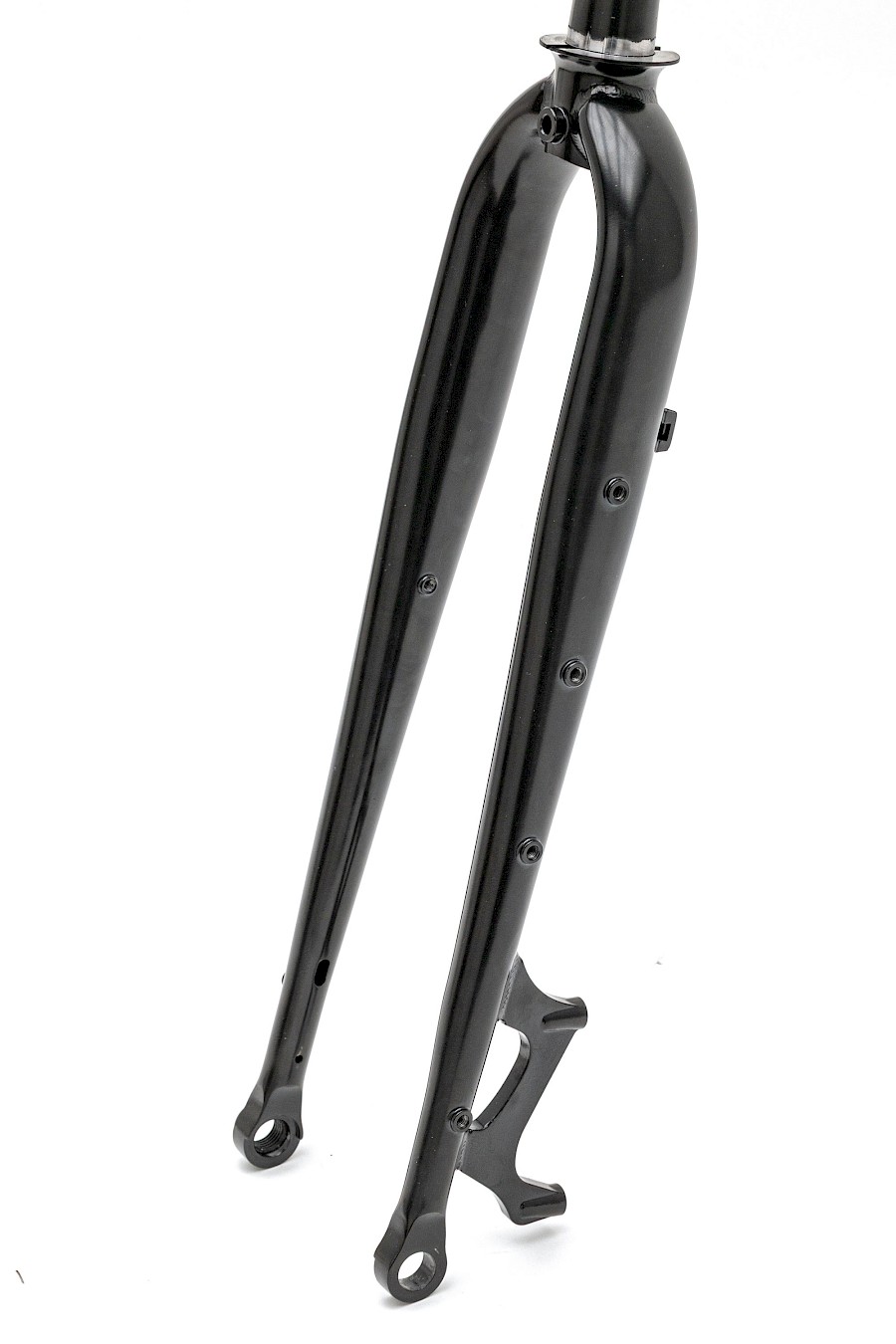Die Stabilität der Gabel wird nicht nur durch das Material Stahl, sondern auch durch ihre elegante Form gewährleistet. Dadurch, dass sich die Gabelscheiden nach unten hin verjüngen, ist sie steif genug, um das Zuladegewicht zu erhöhen. Statt des üblichen Systemgewichts von maximal 150 kg bei unseren Alugabeln sind nun bis zu 180 kg möglich.