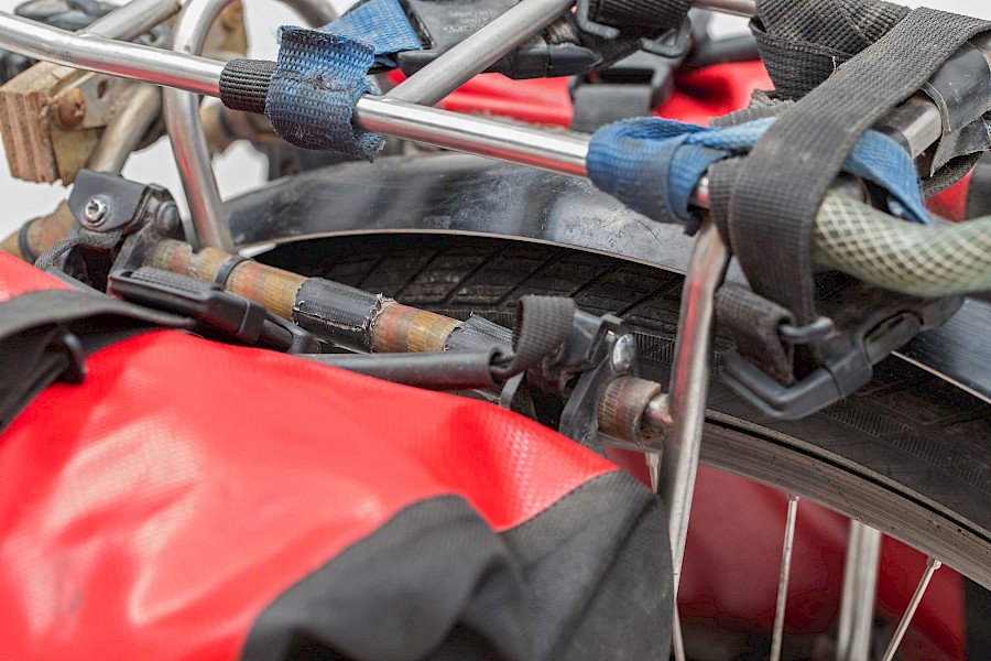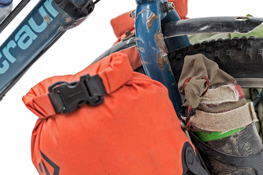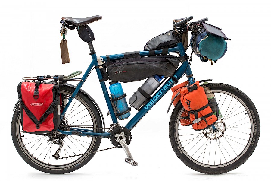 Wir haben den beiden 2017 noch zwei Disc-Gabeln gesponsert, als sie ihre Räder vom klassischen Reiserad in Bikepacking-Räder umgestrickt haben. Interessant ist, dass nicht nur die Velotraum-Rahmen die Strapazen gut überstanden haben (Andis VT-900 in XXXL hat bereits 90.000 Kilometer auf dem Buckel …), auch die Tubus-Träger, die Shimano-Schaltanlage, die Cane Creek-Stützen sind noch Originalteile. Das spricht für deren Qualität und für die Mechaniker- und Wartungsfähigkeiten von Andi ;-)