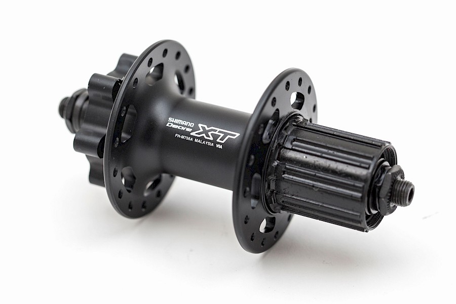 Beim Durchkämmen diverser Bezugsquellen nach Alternativen sind wir per Zufall auf eine XT-756-Nabe für 8/9-fach gestoßen, die der früheren, guten XT-10-fach-Nabe verdammt ähnlich sah. Schnell war geklärt, dass es sich wirklich um die gute XT-Nabe handelt, obwohl es die Dinger eigentlich schon lange nicht mehr geben dürfte. Der Shimano-Importeur hat offensichtlich bei der Artikelbezeichnung brav die Shimano-Nomenklatur befolgt (8/9-fach), obwohl die Abmessung des Freilaufs exakt dem der aktuellen 11-fach Naben entsprechen. Glück für uns – so haben andere Suchende die Dinger entweder übersehen oder gleich aussortiert ;-)